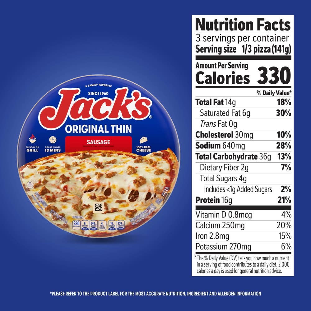 Introducing Jack’s Thin Crust Frozen Sausage Pizza, a delicious blend of 100% real cheese, and sausage made with pork, chicken and beef. Jack’s pizza will become your family’s favorite freezer food. Jack’s has been a trusted brand since 1960, known for their heritage and delicious ingredients. Our frozen pizzas are topped with 100% real cheese, adding a creamy and savory taste to every bite. This sausage pizza is easy to make on a gas grill at 400°F for thirteen minutes or by preheating your oven to 425°F and placing the pizza directly on the center oven rack for thirteen minutes. Enjoy a delicious Jack’s sausage pizza fresh from the oven right in the comfort of your home. • Number of servings: 3 • Packaging: Reusable