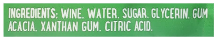Ingredients: Wine, Water, Sugar, Glycerin Gum, Acacia, Xanthan Gum, Citric Acid Contains: Sulfites