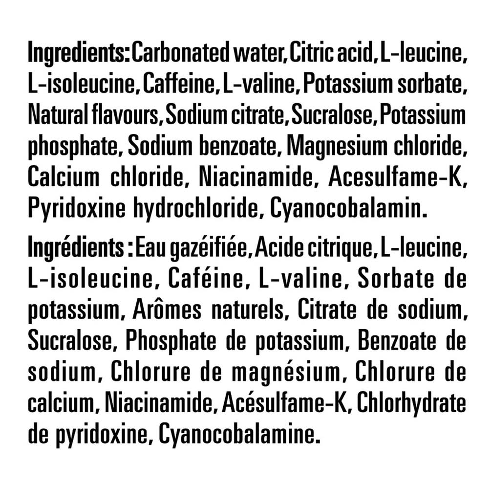 Ingredients: Carbonated Water, Citric Acid, L-Leucine, L-Isoleucine, Caffeine, L-Valine, Potassium Sorbate, Natural Flavours, Sodium Citrate, Sucralose, Potassium Phosphate, Sodium Benzoate, Magnesium Chloride, Calcium Chloride, Niacinamide, Acesulfame-K, Pyridoxine Hydrochloride, Cyanocobalamin