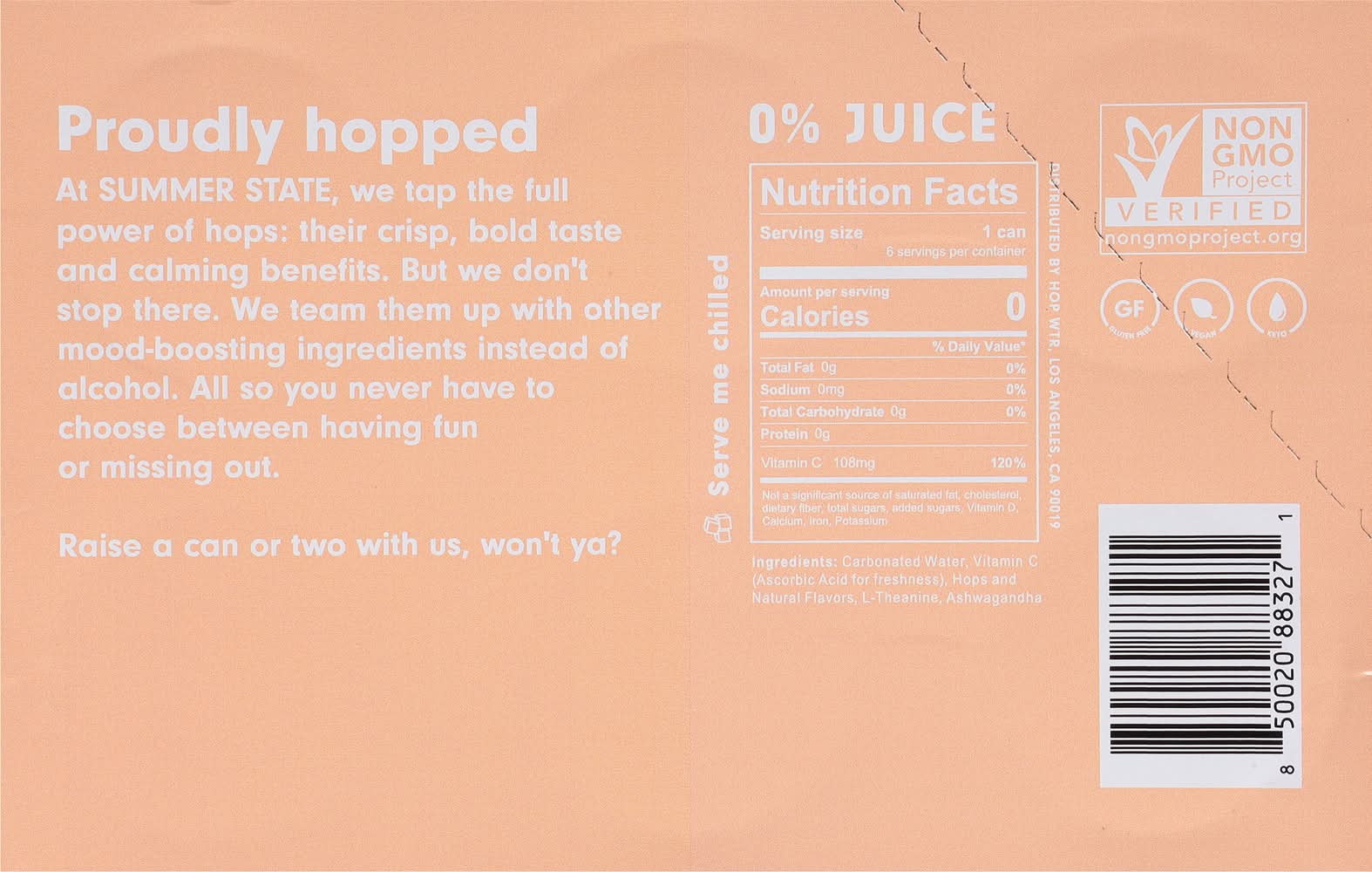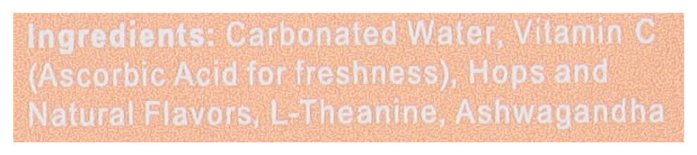Ingredients: Carbonated Water, Vitamin C (Ascorbic Acid for Freshness), Hops and Natural Flavors, L-Theanine, Ashwagandha