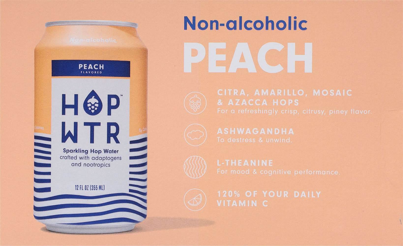 Sparkling Hop Water, Peach, Non-Alcoholic • Flavor: Peach • Features : gluten-free