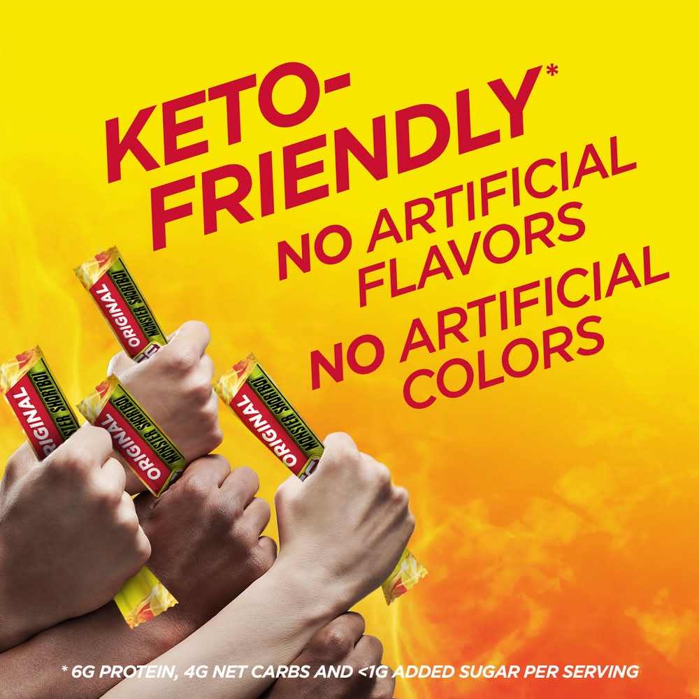 Snap into monster-sized flavor with a Slim Jim Original Monster Shortboi Smoked Snack Stick. Made with beef and pork, chicken and some bold, in-your-face flavor that is crazy good, tame the meat-lover in you with this shortboi snack. Each shortboi snack stick contains no artificial flavors or artificial colors and is individually wrapped so that you can enjoy a savory on the go snack that is perfect for work snacks, school snacks or travel snacks. Don't wait 'til that gigantic hunger comes calling; snap into a Slim Jim Monster Shortboi Smoked Snack Stick for a small snack with big flavor.