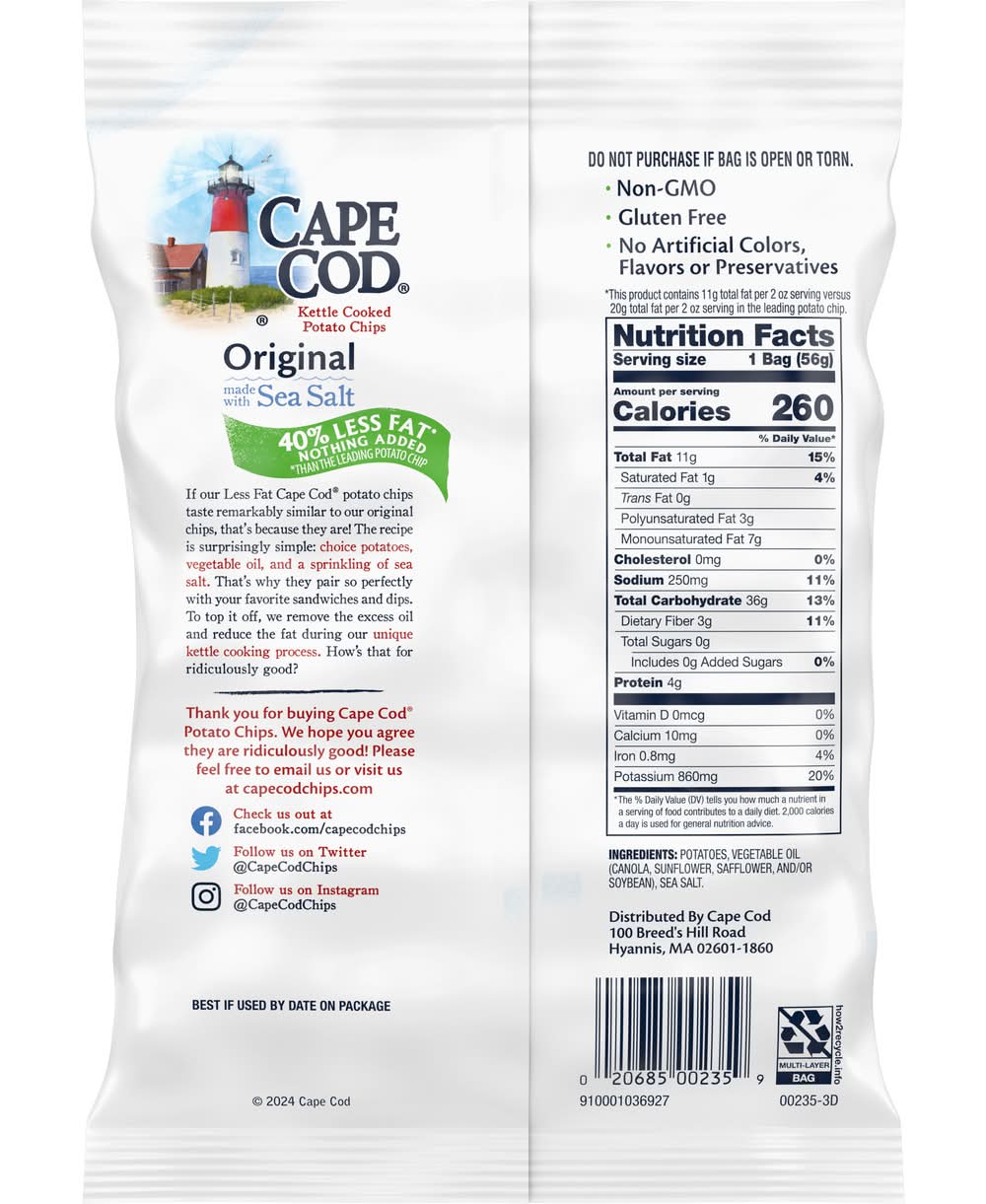 Try Cape Cod Less Fat Original potato chips for a remarkably similar taste to our original chips. With 40% less fat than the leading potato chip, these kettle chips have a simple recipe: choice potatoes, vegetable oil, and a sprinkling of sea salt. To top it of, we remove the excess oil and reduce the fat during our unique kettle cooking process. They're ridiculously good! Cape Cod Potato Chips are known for their quality taste, hearty crunch and distinctly remarkable flavors. These delicious chips are made with premium ingredients beginning with oil, salt and potatoes. Available in many traditional and unique varieties, Cape Cod Potato Chips maintain the tradition of using high quality ingredients in all its snacks.