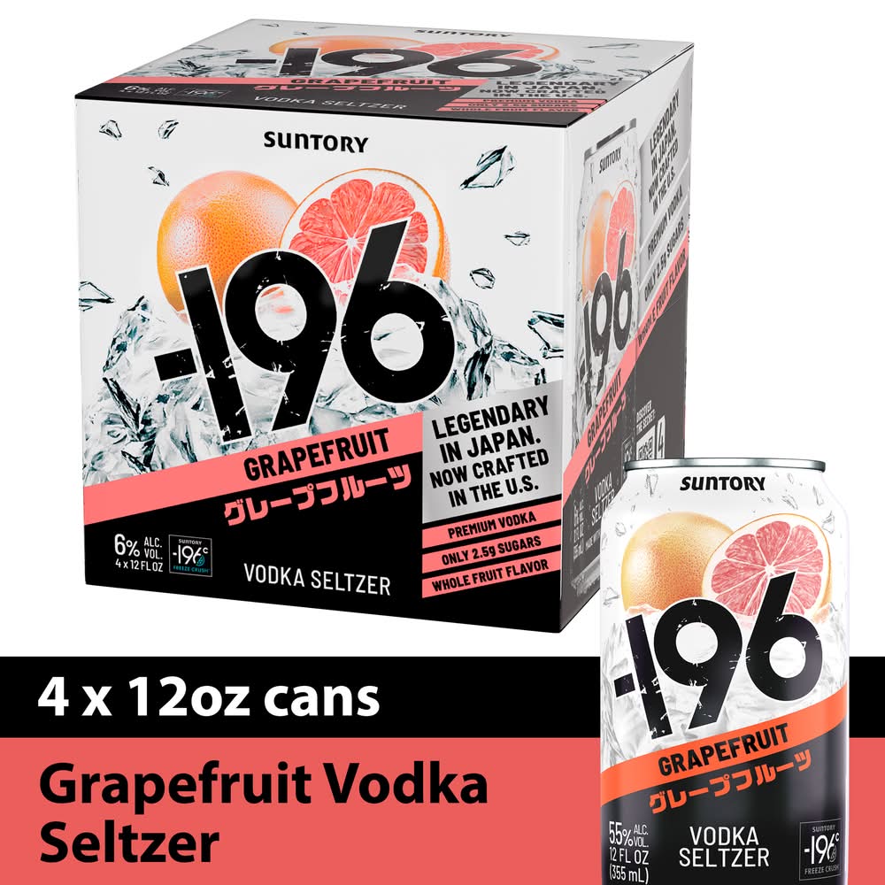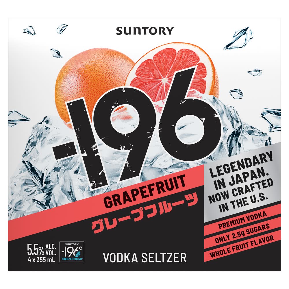 Using Suntory's unique Freeze Crush Infusion technology, whole fruit is frozen in liquid nitrogen at exactly -196°C, crushed, and then infused with premium vodka to capture the whole fruit flavor and create -196 Vodka Seltzer. -196 Grapefruit Vodka Seltzer features a taste of fresh ruby grapefruit, with well-balanced tartness and sweetness. • Flavor: Grapefruit • Pack size: 4 • Alcohol by volume: 5.5%