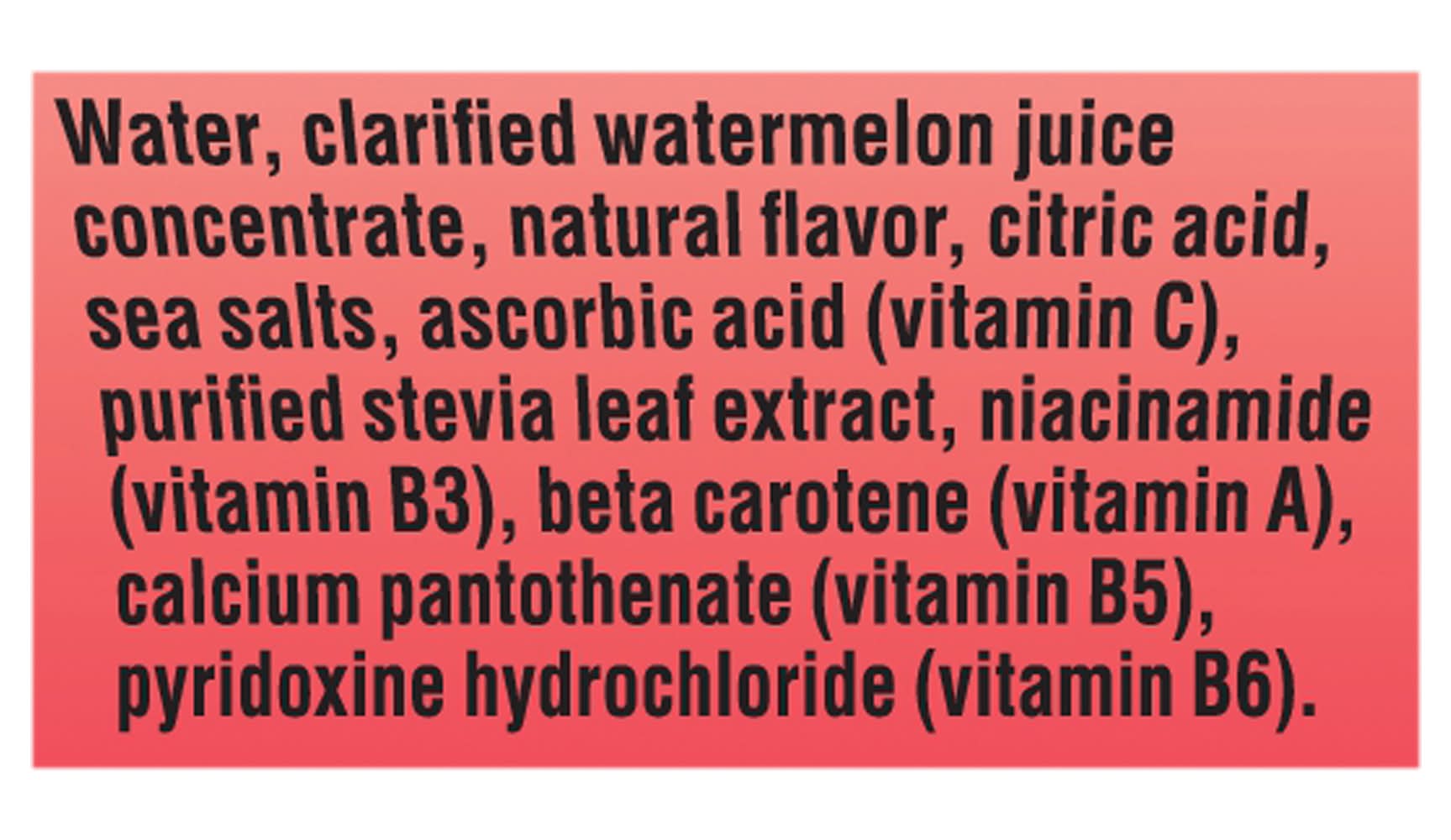 Ingredients: Water, Clarified Watermelon Juice Concentrate, Natural Flavor, Citric Acid, Sea Salts, Ascorbic Acid (Vitamin C), Purified Stevia Leaf Extract, Niacinamide (Vitamin B3), Beta Carotene (Vitamin a), Calcium Pantothenate (Vitamin B5), Pyridoxine Hydrochloride (Vitamin B6)