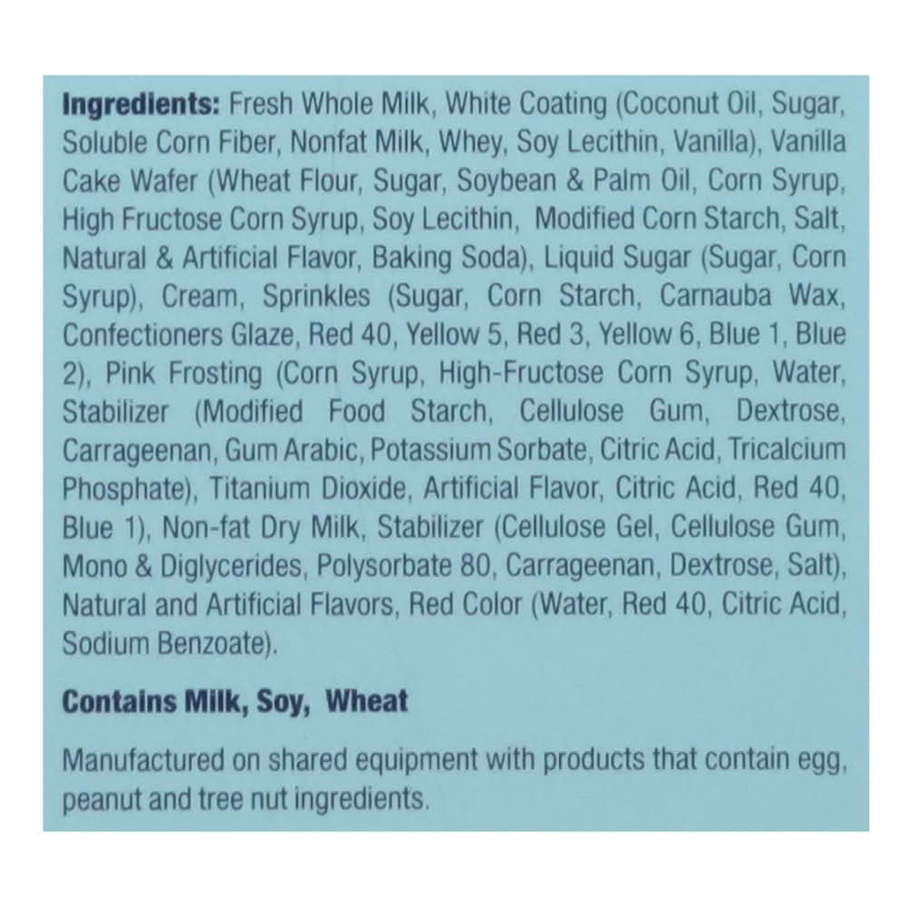 Ingredients: Fresh Whole Milk, White Coating (Coconut Oil, Sugar, Soluble Corn Fiber, Nonfat Milk, Whey, Soy Lecithin, Vanilla), Vanilla Cake Wafer (Wheat Flour, Sugar, Soybean & Palm Oil, Corn Syrup, High Fructose Corn Syrup, Soy Lecithin, Modified Corn Starch, Salt, Natural & Artificial Flavor, Baking Soda), Liquid Sugar (Sugar, Corn Syrup), Cream, Sprinkles (Sugar, Corn Starch, Carnauba Wax, Confectioners Glaze, Red 40, Yellow 5, Red 3, Yellow 6, Blue 1, Blue 2), Pink Frosting (Corn Syrup, High-Fructose Corn Syrup, Water, Stabilizer (Modified Food Starch, Cellulose Gum, Dextrose, Carrageenan, Gum Arabic, Potassium Sorbate, Citric Acid, Tricalcium Phosphate), Titanium Dioxide, Artificial Flavor, Citric Acid, Red 40 Blue 1), Non-Fat Dry Milk, Stabilizer (Cellulose Gel, Cellulose Gum, Mono & Diglycerides, Polysorbate 80, Carrageenan, Dextrose, Salt), Natural and Artificial Flavors, Red Color (Water, Red 40, Citric Acid, Sodium Benzoate) Contains: Milk, Soybeans, Wheat, Corn, Tree Nuts, Coconuts, Eggs, Peanuts, Tree Nuts