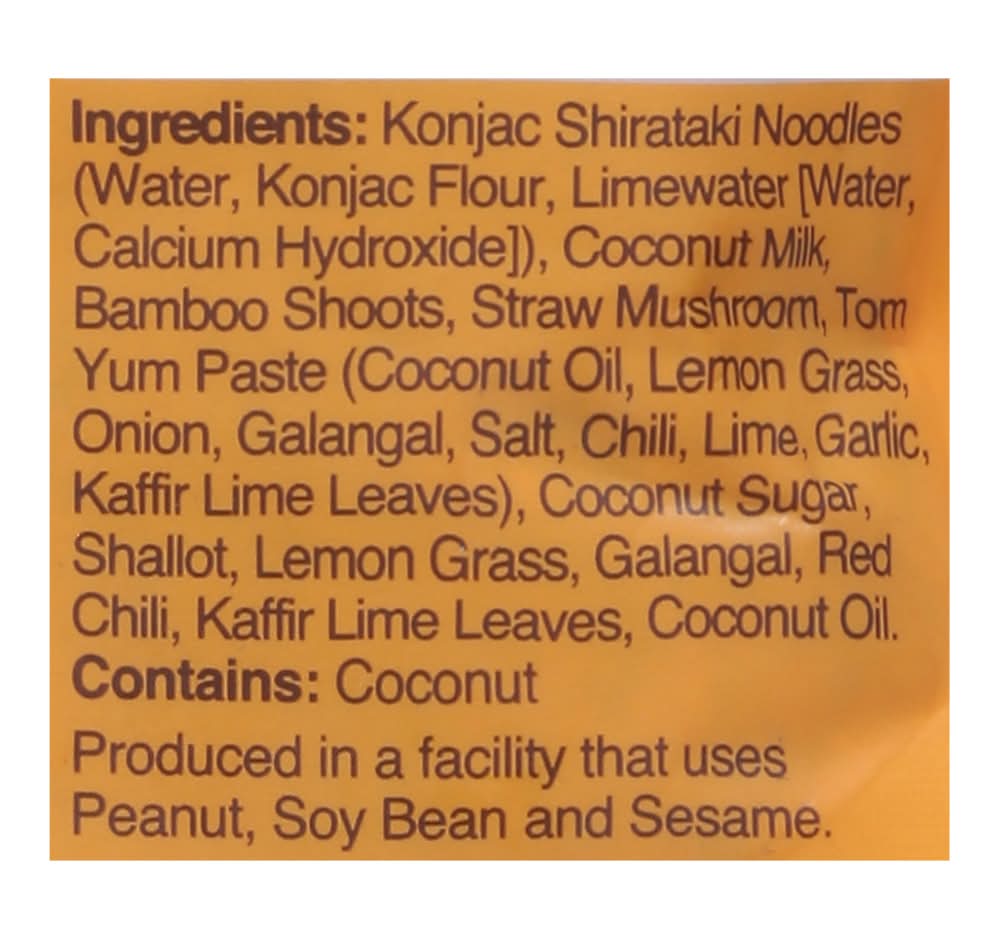 Ingredients: Konjac Shirataki Noodles (Water, Konjac Flour, Limewater [Water, Calcium Hydroxide]), Coconut Milk, Bamboo Shoots, Straw Mushroom, Tom Yum Paste (Coconut Oil, Lemon Grass, Onion, Galangal, Salt, Chili, Lime, Garlic Kaffir Lime (Leaves), Coconut Sugar, Shallot, Lemon Grass, Galangal, Red Chili, Kaffir Lime Leaves, Coconut Oil Contains: Tree Nuts, Coconuts, Peanuts, Soybeans, Sesame