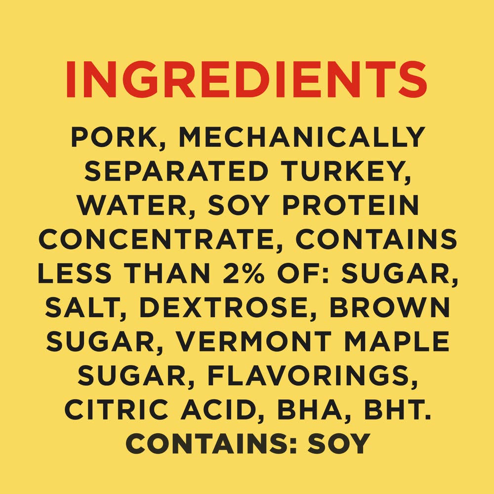 Ingredients: Pork, Mechanically Separated Turkey, Water, Soy Protein Concentrate, Contains 2% or less of: Sugar, Salt, Dextrose, Brown Sugar, Vermont Maple Sugar, Flavorings, Citric Acid, BHA, BHT. CONTAINS: SOY. Contains: Soy