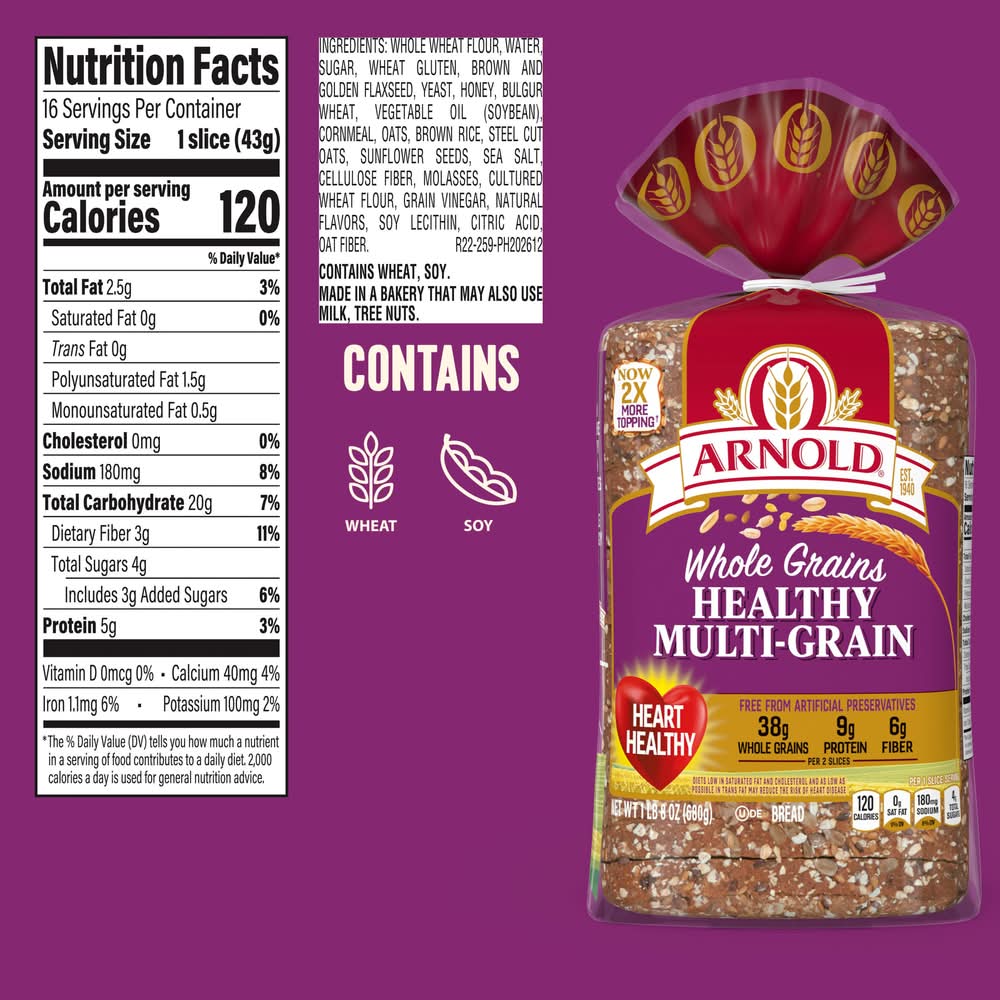 Ingredients: WHOLE WHEAT FLOUR, WATER, SUGAR, WHEAT GLUTEN, BROWN AND GOLDEN FLAXSEED, YEAST, HONEY, BULGUR WHEAT, VEGETABLE OIL (SOYBEAN), CORNMEAL, OATS, BROWN RICE, STEEL CUT OATS, SUNFLOWER SEEDS, SEA SALT, CELLULOSE FIBER, MOLASSES, CULTURED WHEAT FLOUR, GRAIN VINEGAR, NATURAL FLAVOR, SOY LECITHIN, CITRIC ACID, OAT FIBER. Contains: CONTAINS SOY, WHEAT.