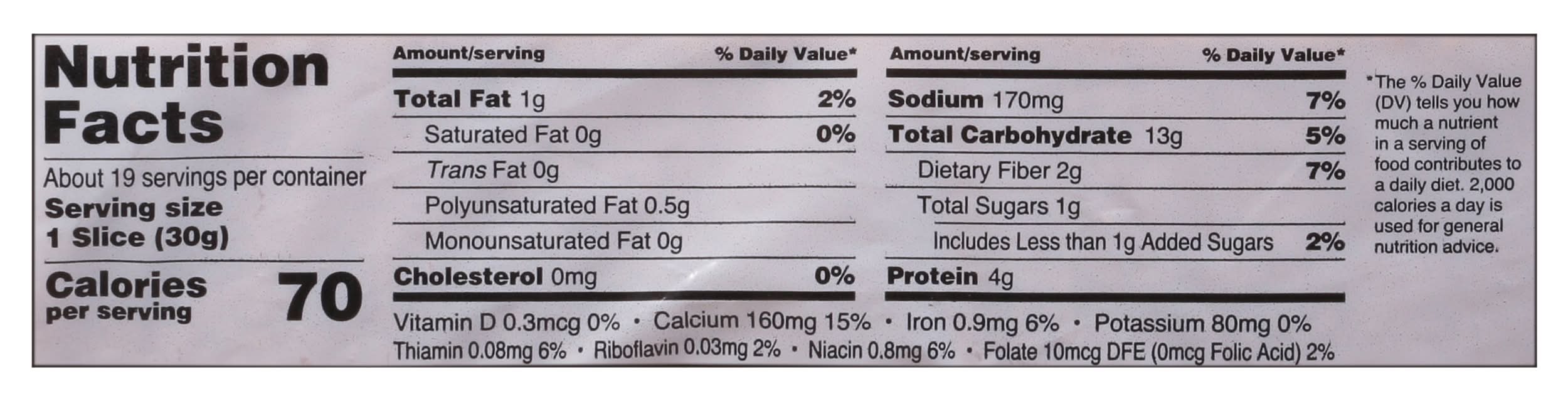 Ingredients: Whole Wheat Flour, Water, Wheat Gluten, Yeast, Contains Less than 2% of Each of the Following: Sugar, Soybean Oil, Salt, Calcium Carbonate, Dried Molasses, Wheat Flour, Wheat Starch, Honey, Calcium Propionate (a Preservative), Distilled Monoglycerides, Guar Gum, Vegetable Oil (Contains One or More of the Following: Canola Oil, Soybean Oil, High Oleic Soybean Oil), Hydrogenated Soybean Oil, Enzymes, Ascorbic Acid (Dough Conditioner), Soy Lecithin, Sunflower Lecithin Contains: Wheat, Soybeans, Gluten, Milk