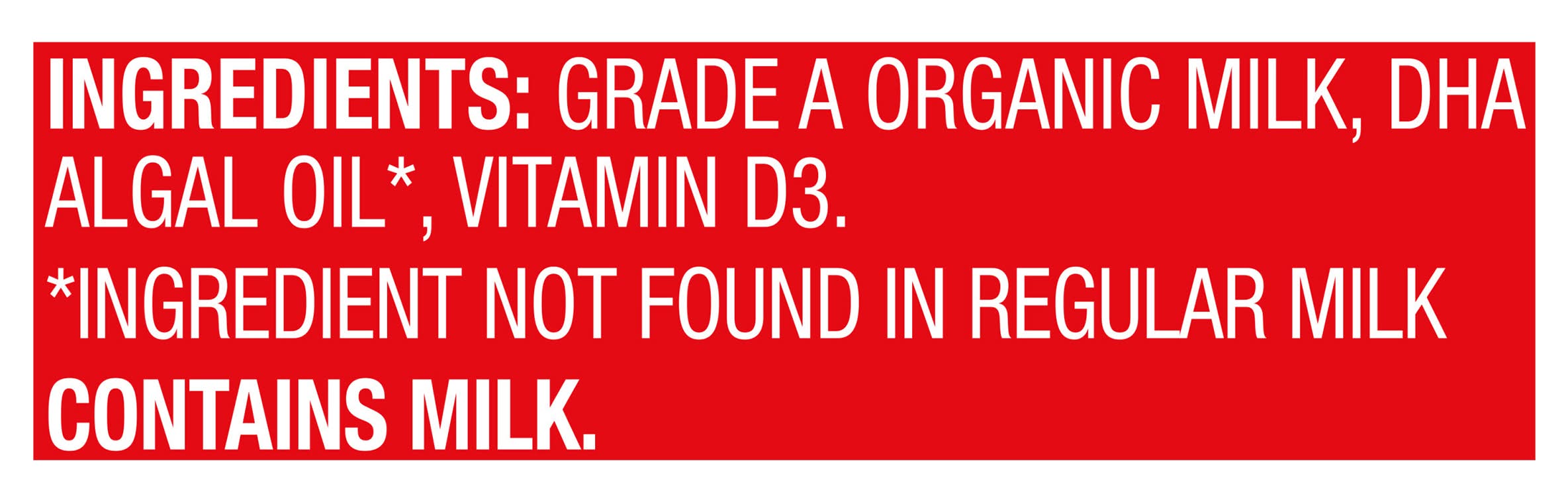 Ingredients: Grade A Organic Milk, DHA Algal Oil (Ingredient Not Found in Regular Milk), Vitamin D3 Contains: Milk