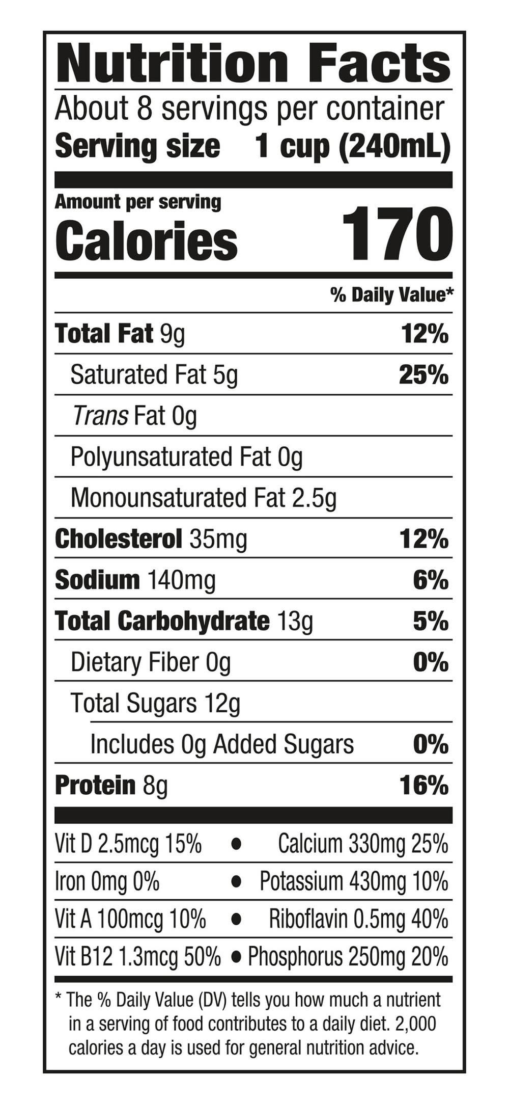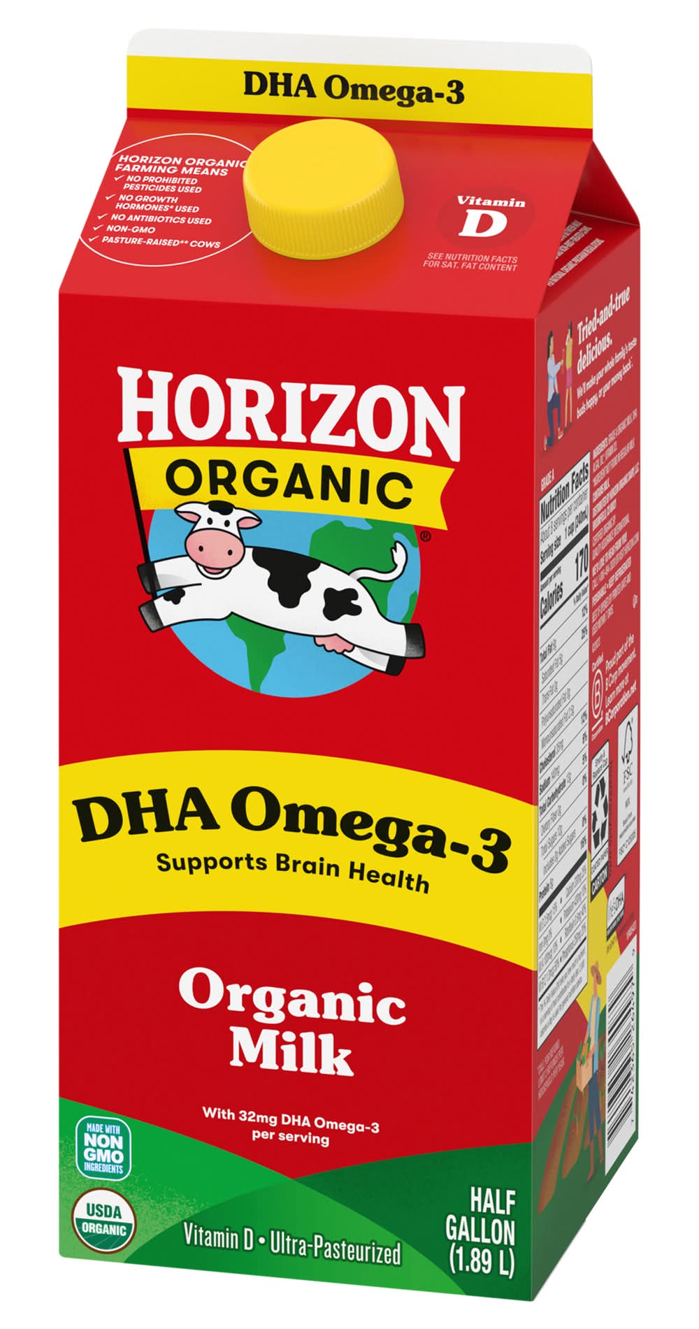 USDA Organic. Certified Organic by Quality Assurance International. DHA Omega-3. With 32 mg DHA Omega-3 per serving. Vitamin D. See nutrition facts for sat. fat content. Made with non GMO ingredients. Non-GMO. Ultra-pasteurized. Horizon organic farming means. No prohibited pesticides used. No growth hormones (no significant differences has been shown between milk derived from best-treated and non-best-treated cows) used. No antibiotic used. Non-GMO. Pasture-raised (per national organic program regulations) cows. Trusted since 1991. Two generations of families - and counting - have grown up on horizon organic milk. We love cows. Our cows get plenty of sunshine and fresh air. They eat an all-organic, non-GMO diet and are not given added hornoes or antibiotics. Stewarding the land. We offer regenerative agriculture education to help our farmers create nutrient-rich soil. A happy healthy future. Caring for your family every day - and our farming family too - is how we nourish a bright tomorrow for generations to come. See how wee do it at horizon.com. Get DHA omega-3 the easy way. In a glass of milk! An important nutrient, DHA helps to support brain and eye health. From our farmers to your family. We proudly partner with over 500 farmers to bring high-quality certified organic to your table. Tried-and-true delicious. • Number of servings: 8 • Horizon Organic Dairy, Broomfield, CO, 80021 • Packaging: Reusable