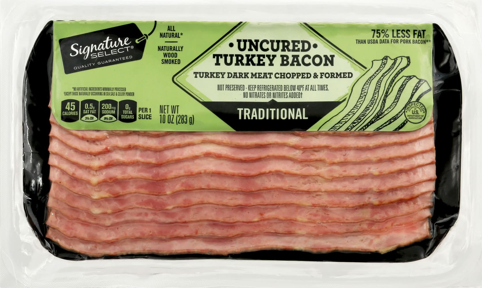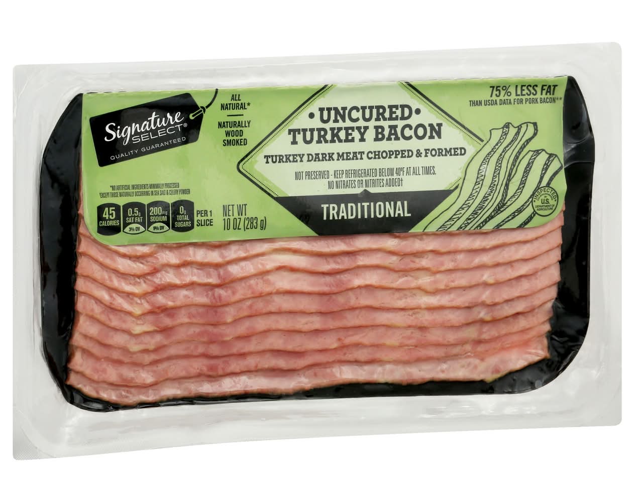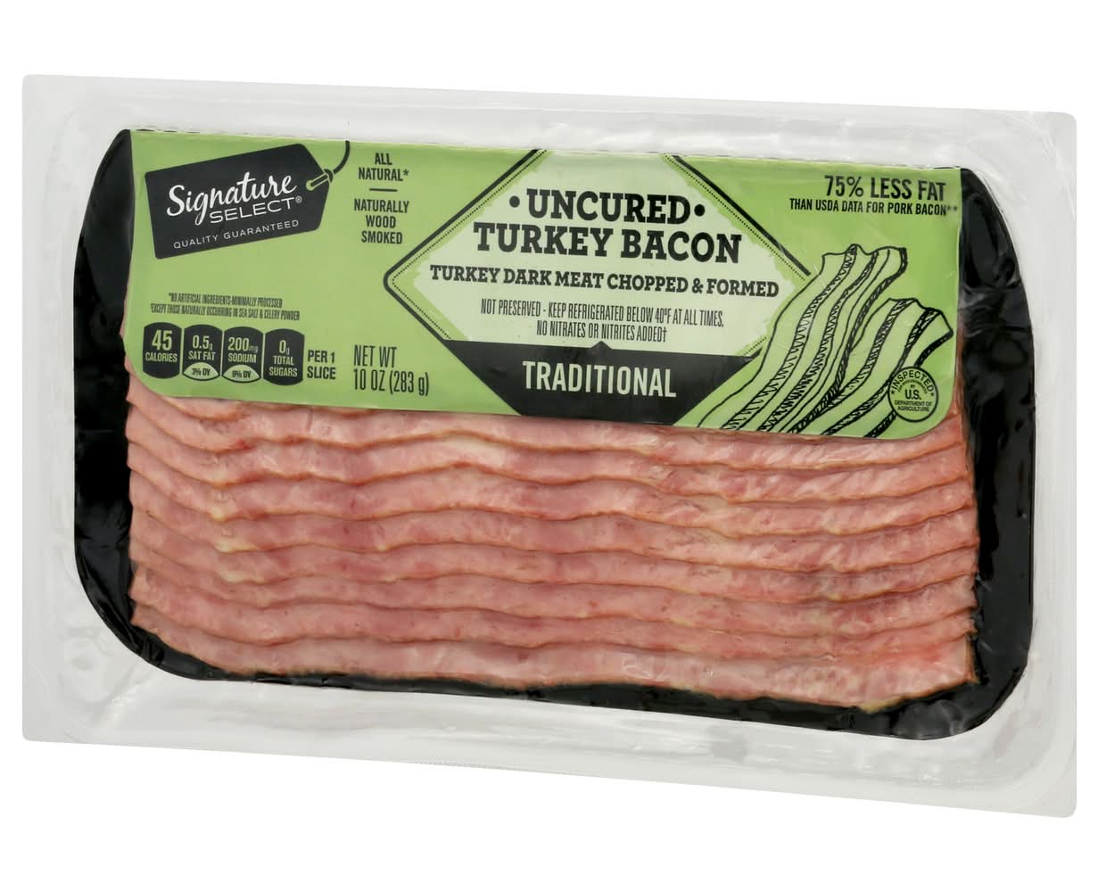 Signature Select Select Uncured Traditional Turkey Bacon is made from chopped and formed dark turkey meat. The product is gluten-free and made from all-natural ingredients, having undergone minimal processing. It is naturally wood-smoked, not preserved, and does not contain added nitrates or nitrites, except those naturally occurring in sea salt and celery powder. Number of servings: 10