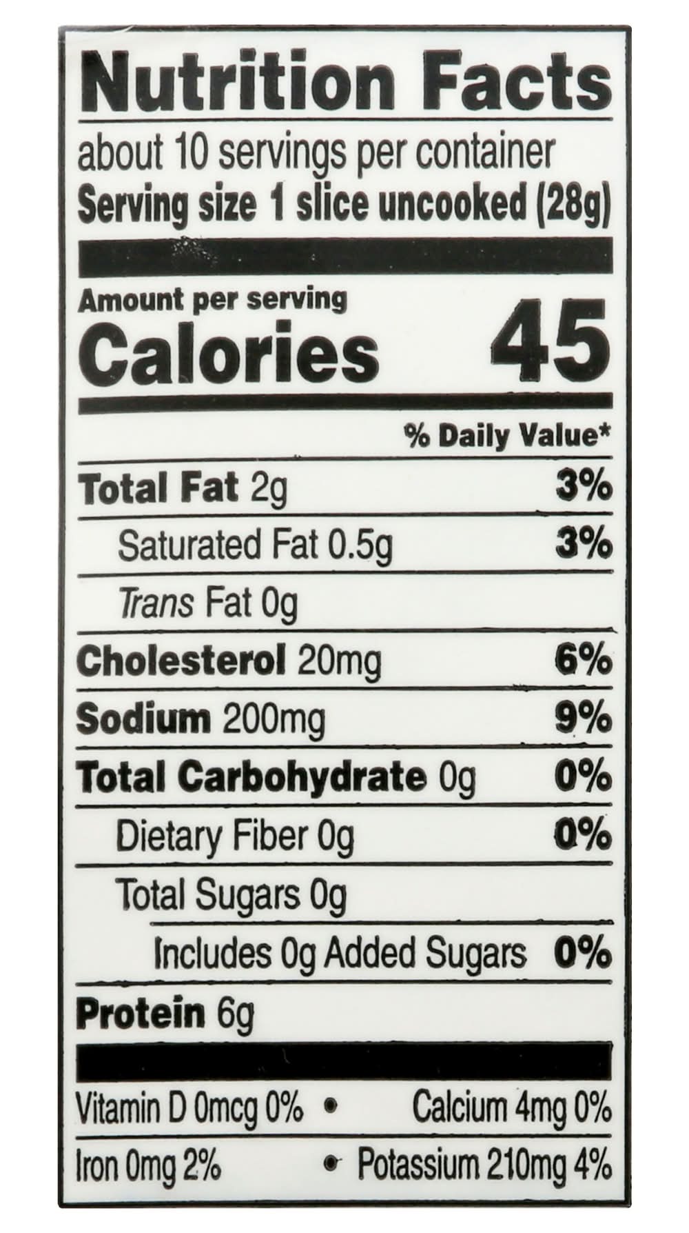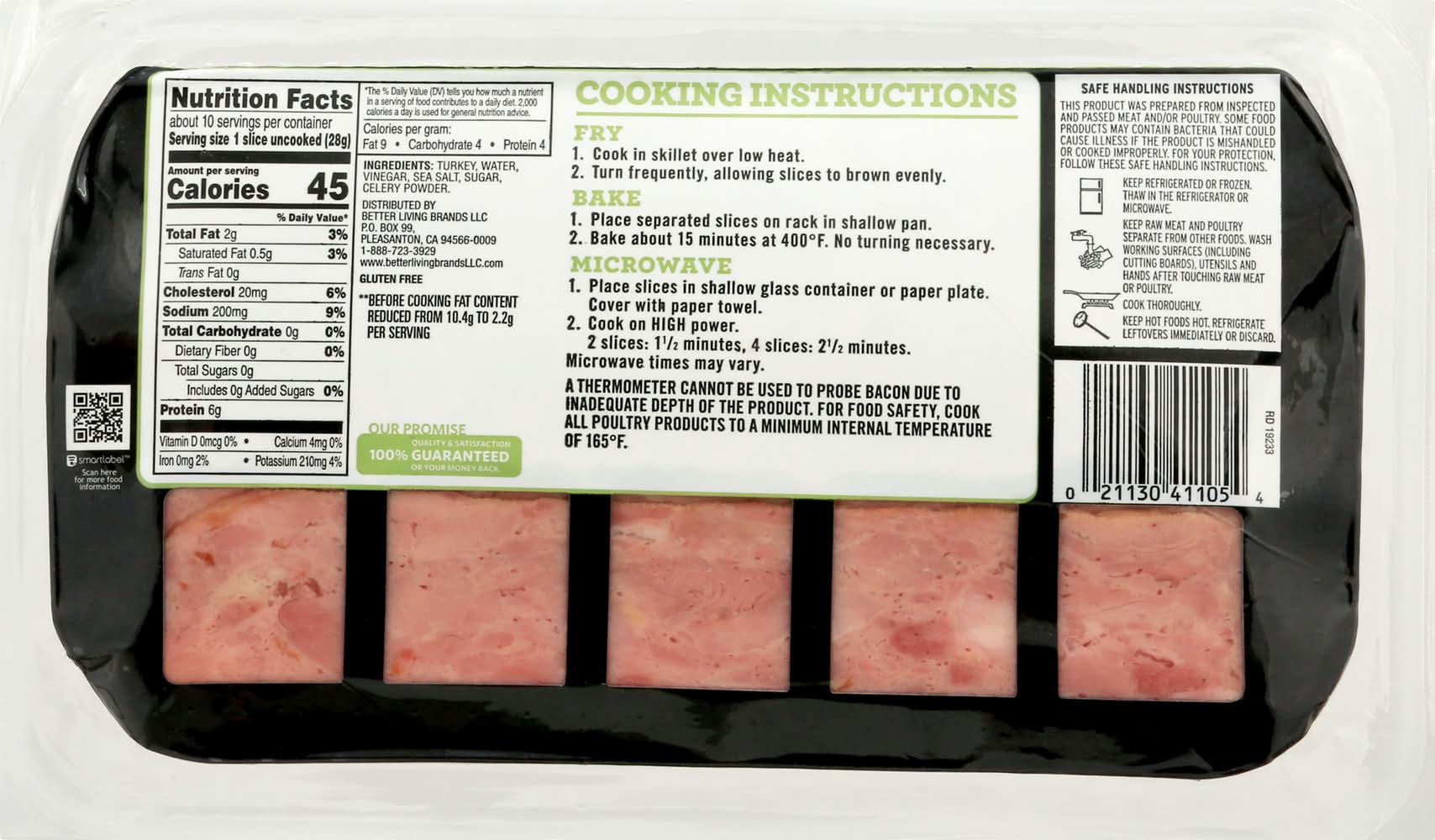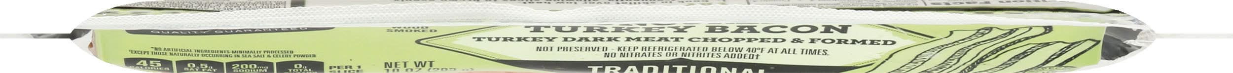 Signature Select Select Uncured Traditional Turkey Bacon is made from chopped and formed dark turkey meat. The product is gluten-free and made from all-natural ingredients, having undergone minimal processing. It is naturally wood-smoked, not preserved, and does not contain added nitrates or nitrites, except those naturally occurring in sea salt and celery powder. Number of servings: 10