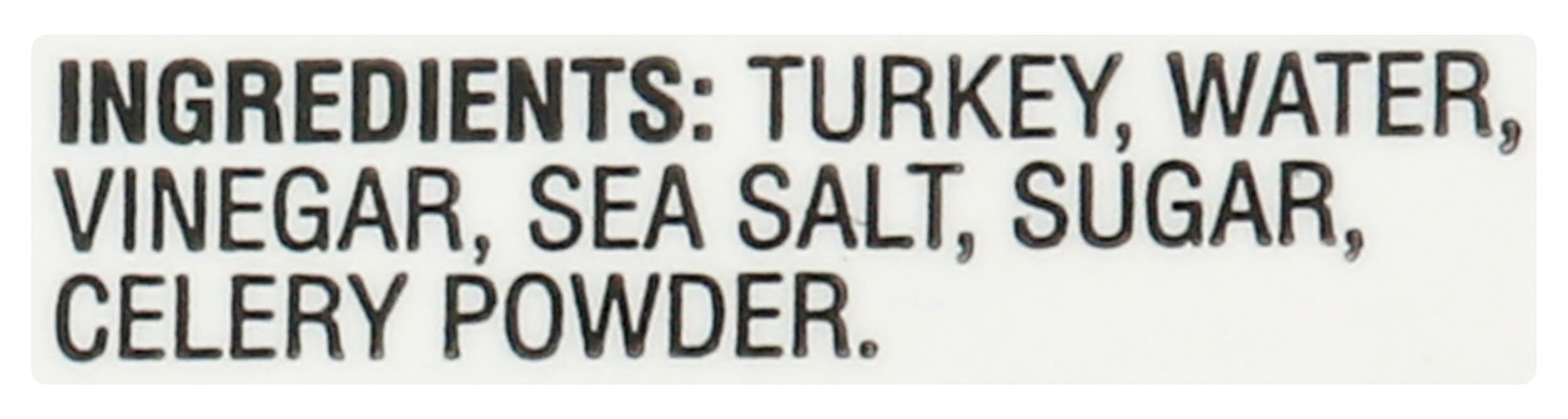 Ingredients: Turkey, Water, Vinegar, Sea Salt, Sugar, Celery Powder.