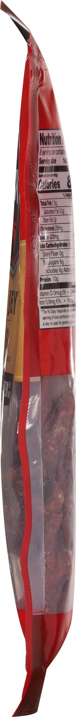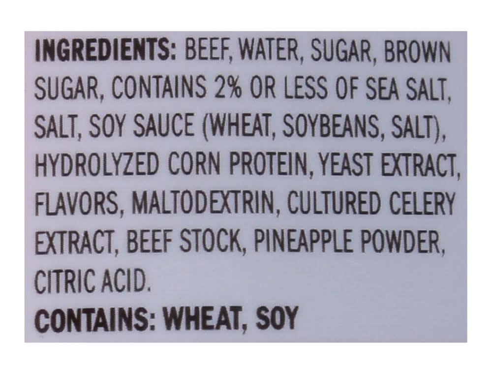 Ingredients: Beef, Water, Sugar, Brown Sugar, Contains 2% or Less of Sea Salt, Salt, Soy Sauce (Wheat, Soybeans, Salt), Hydrolyzed Corn Protein, Yeast Extract, Flavors, Maltodextrin, Cultured Celery Extract, Beef Stock, Pineapple Powder, Citric Acid Contains: Wheat, Soybeans, Corn, Celery