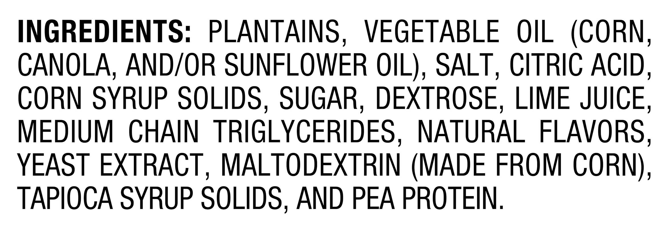 Ingredients: Plantains, Vegetable Oil (Corn, Canola, and/or Sunflower Oil), Salt, Citric Acid, Corn Syrup Solids, Sugar, Dextrose, Lime Juice, Medium Chain Triglycerides, Natural Flavors, Yeast Extract, Maltodextrin (Made from Corn), Tapioca Syrup Solids, and Pea Protein Contains: Corn