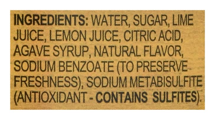 Ingredients: Water, Sugar, Lime Juice, Lemon Juice, Citric Acid, Agave Syrup, Natural Flavor, Sodium Benzoate (to Preserve Freshness), Sodium Metabisulfite (Antioxidant - Contains Sulfites) Contains: Sulfites