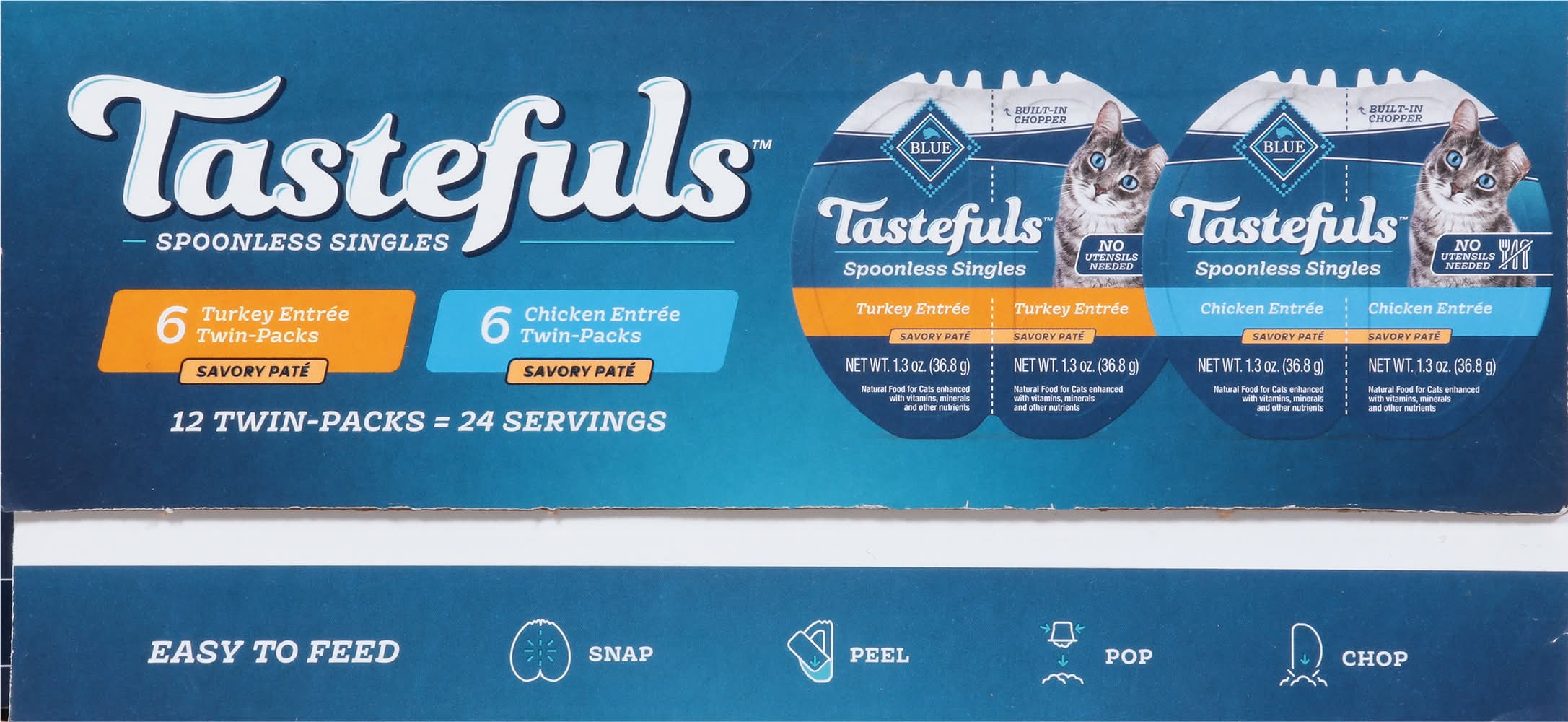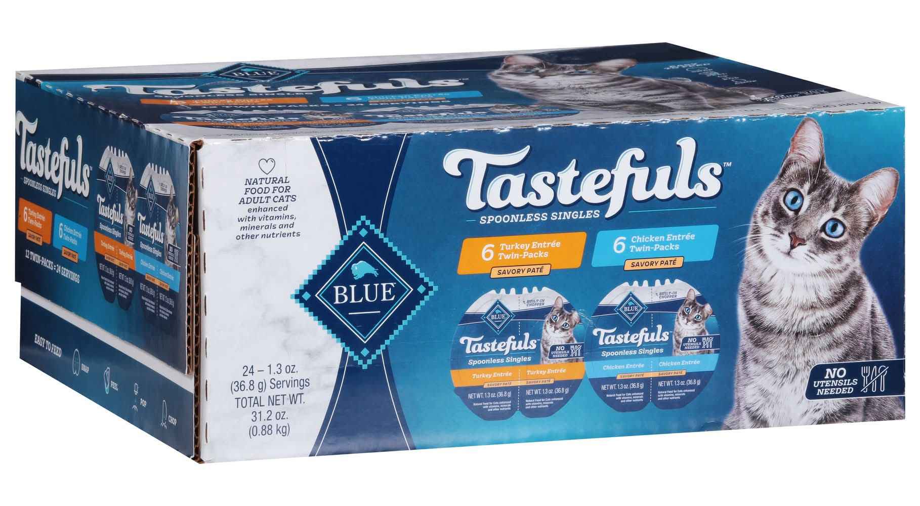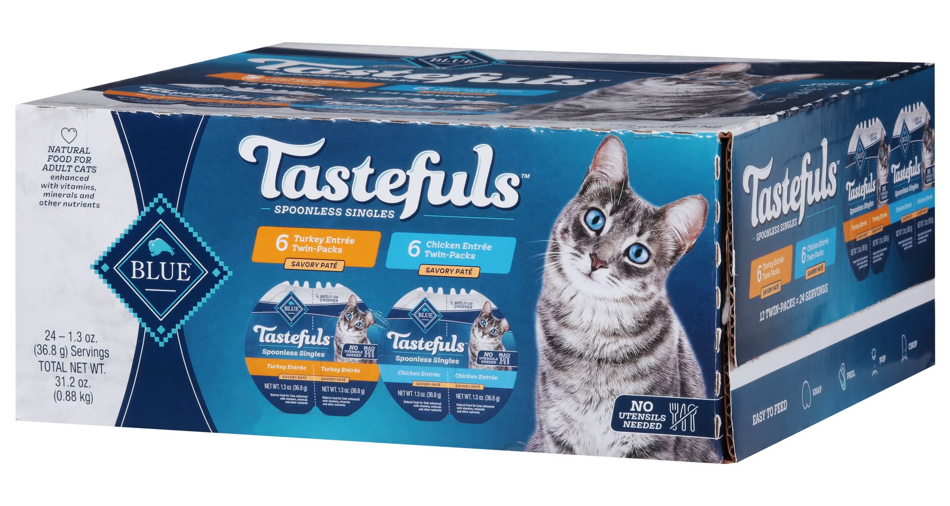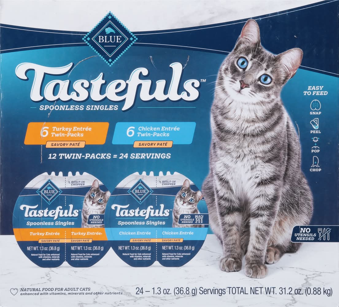 Pack offers a natural food choice for adult cats, providing a savory pate that is enhanced with vitamins, minerals, and other nutrients. The product contains no artificial flavors or preservatives and is free from corn, wheat, and soy. Each pack includes twin-packs that are designed for ease of feeding without the need for utensils. The packaging allows for a simple feeding process: snap, peel, and pop. Features real turkey or chicken as the first ingredient, without any chicken or poultry by-product meals. Size: 2.70 lb