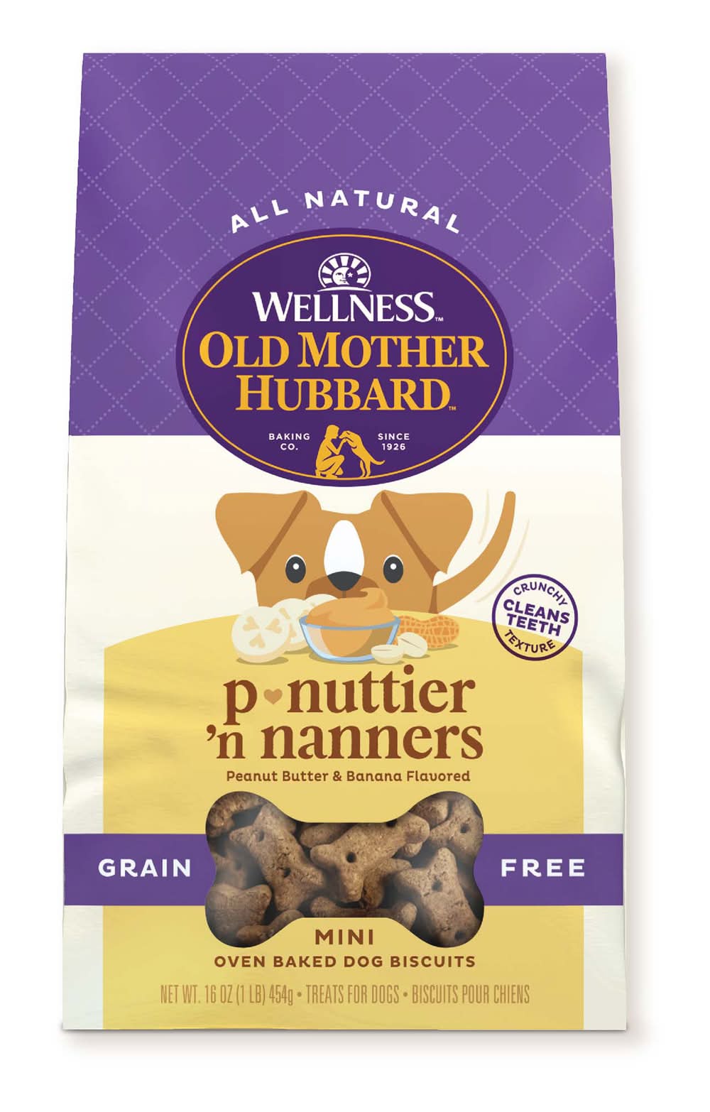 Calorie Content (Calculated): This product contains 3,520 kcal/kg or 10 kcal/piece ME (metabolizable energy) on an as fed basis. All natural. No artificial preservatives. Est. 1926. All natural dog snacks. Biscuits pour chiens. Since 1926, Old Mother Hubbard has used the same simple methods to bake our snacks for dogs. Why change? Each home-style recipe is carefully crafted from wholesome ingredients that allow you to feel good about giving them a reward that is healthy and heartfelt. So today and every day, give ‘em some snack love with Old Mother Hubbard. Our grain free biscuits are sure to be your dog's favorite treat! Crafted from time honored recipes, these oven-baked snacks use the finest all-natural ingredients and have a delicious crunch your dog will love! Banana. Gran free. Peanut butter. Flaxseed. P-Nutter N' Nanners. Our Guarantee: If for any reason you or your dog are not satisfied with this product, just bring the unused portion, packaging and receipt back to the place of purchase for a full refund or exchange. WellPet Foundation: At Old Mother Hubbard, we are committed to giving back to the world we share with our pets. Try our other delicious Old Mother Hubbard natural grain free snacks for dogs! Pick of the patch. pumpkin & carrot flavored. All the Fixins. turkey & sweet potato flavored. Made in Canada from the finest globally sourced ingredients. Size: 1.22 lb