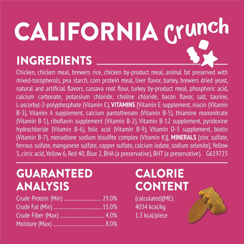 Ingredients: Chicken, Chicken Meal, Brewers Rice, Chicken By-Product Meal, Animal Fat Preserved With Mixed-Tocopherols, Pea Starch, Corn Protein Meal, Liver Flavor, Barley, Brewers Dried Yeast, Natural And Artificial Flavors, Cassava Root Flour, Turkey By-Product Meal, Phosphoric Acid, Calcium Carbonate, Potassium Chloride, Choline Chloride, Bacon Flavor, Salt, Taurine, L-Ascorbyl-2-Polyphosphate (Vitamin C), VITAMINS [Vitamin E Supplement, Niacin (Vitamin B-3), Vitamin A Supplement, Calcium Pantothenate (Vitamin B-5), Thiamine Mononitrate (Vitamin B-1), Riboflavin Supplement (Vitamin B-2), Vitamin B-12 Supplement, Pyridoxine Hydrochloride (Vitamin B-6), Folic Acid (Vitamin B-9), Vitamin D-3 Supplement, Biotin (Vitamin B-7), Menadione Sodium Bisulfite Complex (Vitamin K)], MINERALS [Zinc Sulfate, Ferrous Sulfate, Manganese Sulfate, Copper Sulfate, Calcium Iodate, Sodium Selenite], Yellow 5, Citric Acid, Yellow 6, Red 40, Blue 2, Bha (A Preservative), Bht (A Preservative), . G619723 Contains: 'Contains Gluten'