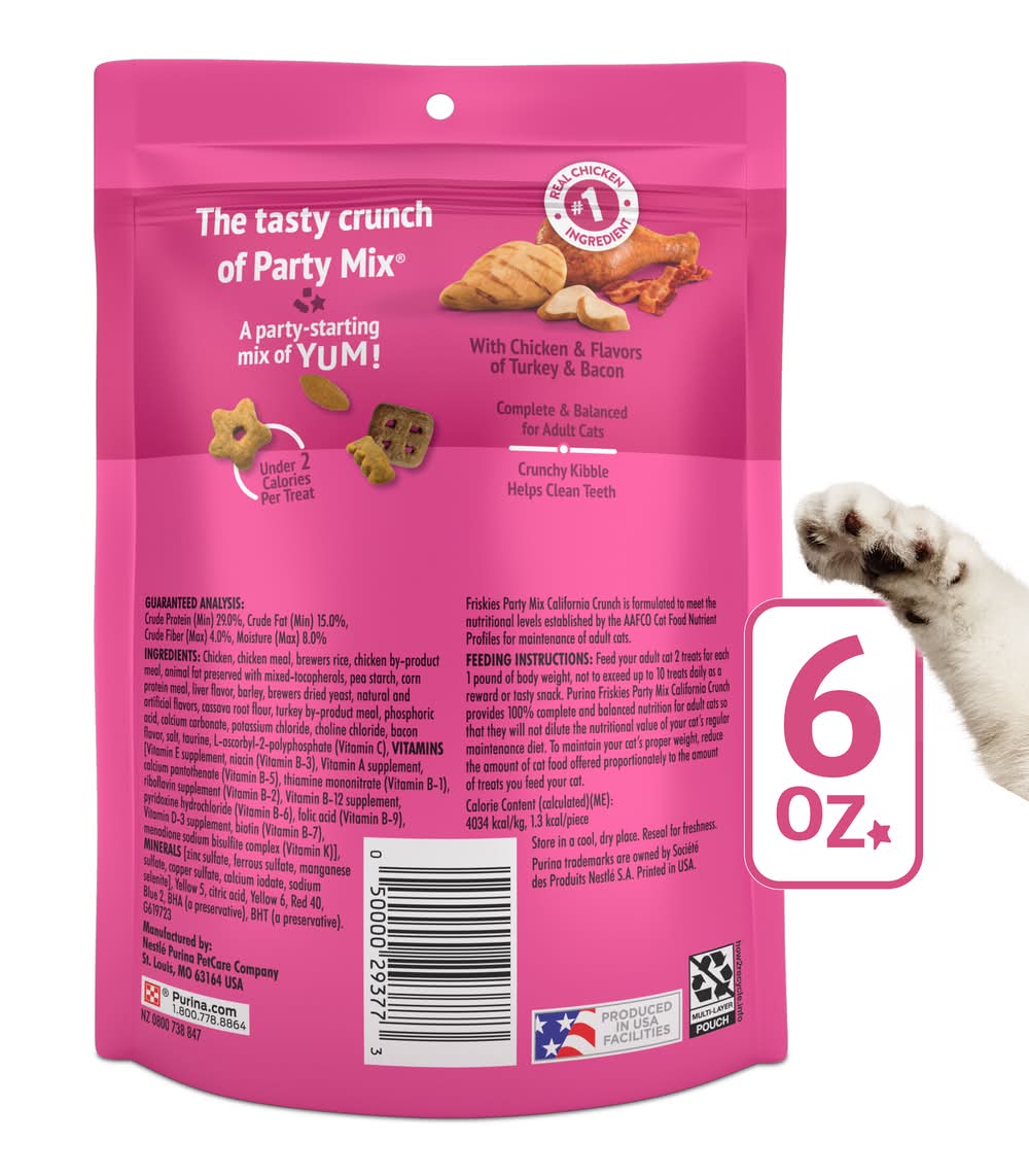Treat your lovable cat like an A-list celebrity when you feed her Purina Friskies Party Mix California Crunch adult kitty treats for cats. Your furry starlet can enjoy guilt-free snacking, because each of these Purina Friskies Party Mix cat treats contains less than 2 calories. Watch her snap into action as you open a pouch of these delicious Friskies treats that contain real chicken as the number 1 ingredient, letting you feel confident that she's getting 100 percent complete and balanced nutrition for adult cats. Turkey and bacon accents play supporting roles in this Party Mix cat treats recipe, providing that yummy flavor that keeps your cat interested and makes her purr. The crunchy texture of these Friskies cat treats has the added benefit of helping keep her teeth clean, ensuring she's always ready for her close-up. Earn a Best Pet Parent nomination from your cat when you tempt her taste buds with Purina Friskies Party Mix California Crunch adult kitty treats for cats. • Size: 0.51 lb • Nestle Purina PetCare Company, St Louis, MO, 63164, Ph: 800-778-8864