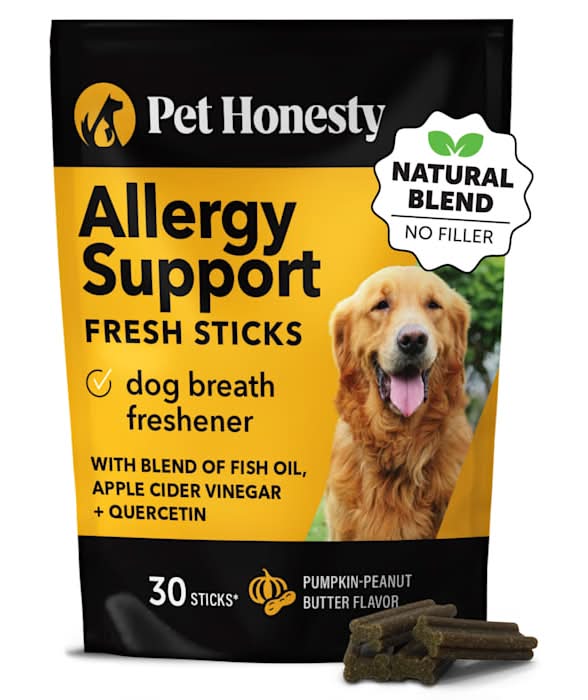 Help keep your canine companion happy and healthy with the PetHonesty Allergy Support Fresh Sticks Dog Dental Treats. These treats are formulated with natural ingredients like quercetin, colostrum and omegas to support a healthy immune system and help reduce the impact of seasonal allergies on your pup. They also promote overall dental health-these treats are designed with ridges and a special texture to help brush off plaque and tartar. Pooches of all sizes will go head-over-tail for these mouthwatering morsels! Size: 1.06 lb