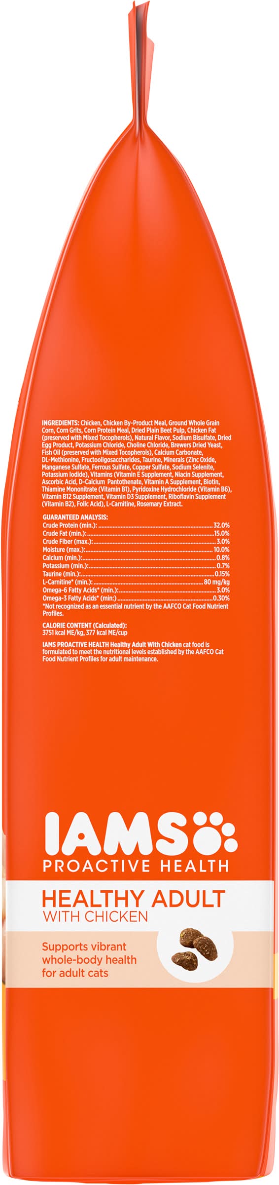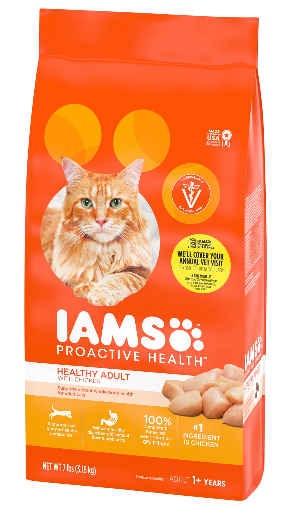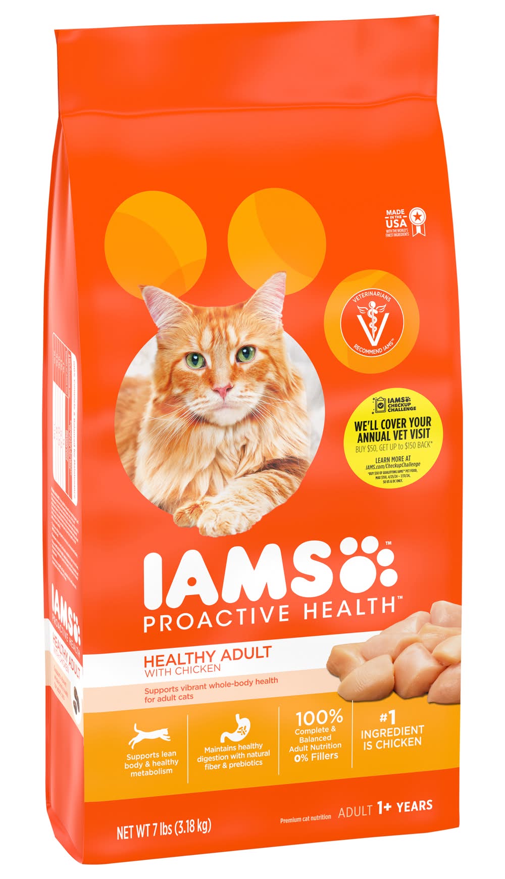 Premium cat nutrition.1 + years Veterinarians recommend IAMS. Supports vibrant whole-body health for adult cats. Supports lean body & healthy metabolism. Maintains healthy digestion with natural fiber & prebiotics. 100% Complete & balanced adult nutrition, 0% fillers. IAMS Healthy Adult supports overall health with delicious chicken your cat loves. Key benefits in this recipe: Strong Muscles: Real chicken as the 1st ingredient helps maintain strong muscles. Healthy Teeth: Crunchy kibble helps reduce plaque build-up. Healthy Heart: Essential nutrients, including calcium & potassium, help nourish a healthy heart. Healthy Digestion: Unique fiber blend with prebiotics & beet pulp support your cat's ability to absorb nutrients. • Size: 7.31 lb • Mars Petcare US, New Zealand by Mars NZ Ltd., P.O. Box 683006, Franklin, TN,