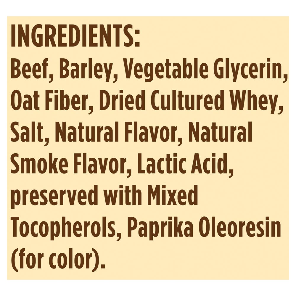 Ingredients: Beef, Barley, Vegetable Glycerin, Oat Fiber, Dried Cultured Whey, Salt, Natural Flavor, Natural Smoke Flavor, Lactic Acid, Preserved with Mixed Tocopherols, Paprika Oleoresin (for Color) Contains: Barley, Oat
