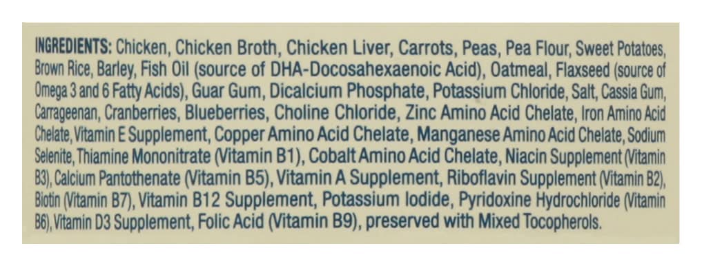 Ingredients: Chicken, Chicken Broth, Chicken Liver, Carrots, Peas, Pea Flour, Sweet Potatoes, Brown Rice, Barley, Fish Oil (Source of DHA-Docosahexaenoic Acid), Oatmeal, Flaxseed (Source of Omega 3 and 6 Fatty Acids), Guar Gum, Dicalcium Phosphate, Potassium Chloride, Salt, Cassia Gum, Carrageenan, Cranberries, Blueberries, Choline Chloride, Zinc Amino Acid Chelate, Iron Amino Acid Chelate, Vitamin E Supplement, Copper Amino Acid Chelate, Manganese Amino Acid Chelate, Sodium Selenite, Thiamine Mononitrate (Vitamin B1), Cobalt Amino Acid Chelate, Niacin Supplement (Vitamin B3), Calcium Pantothenate (Vitamin B5), Vitamin A Supplement, Riboflavin Supplement (Vitamin B2), Biotin (Vitamin B7), Vitamin B12 Supplement, Potassium Iodide, Pyridoxine Hydrochloride (Vitamin B6), Vitamin D3 Supplement, Folic Acid (Vitamin B9), Preserved with Mixed Tocopherols Contains: Fish