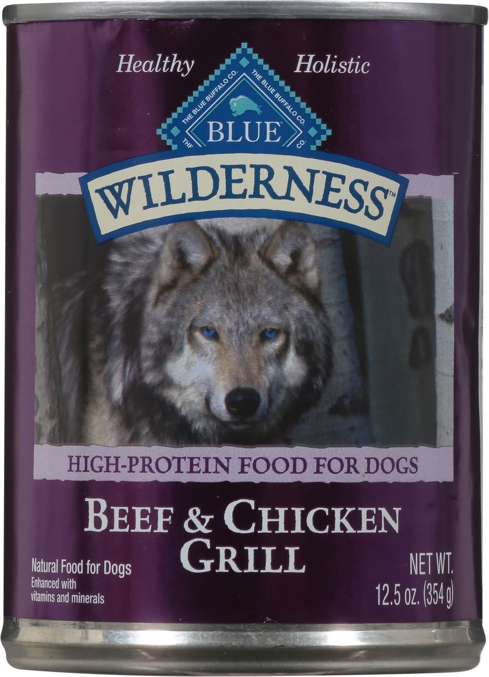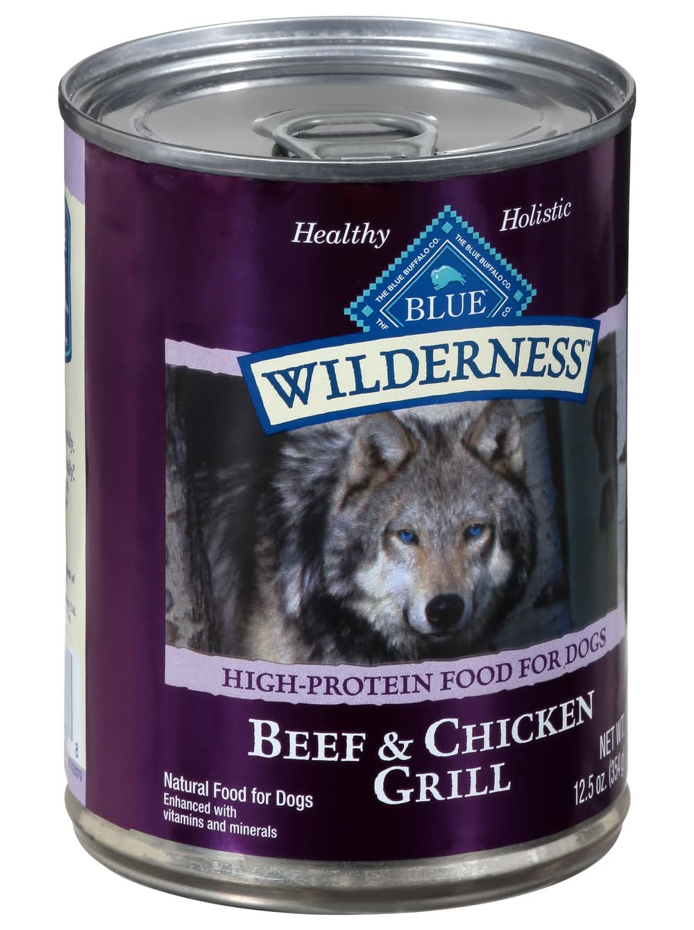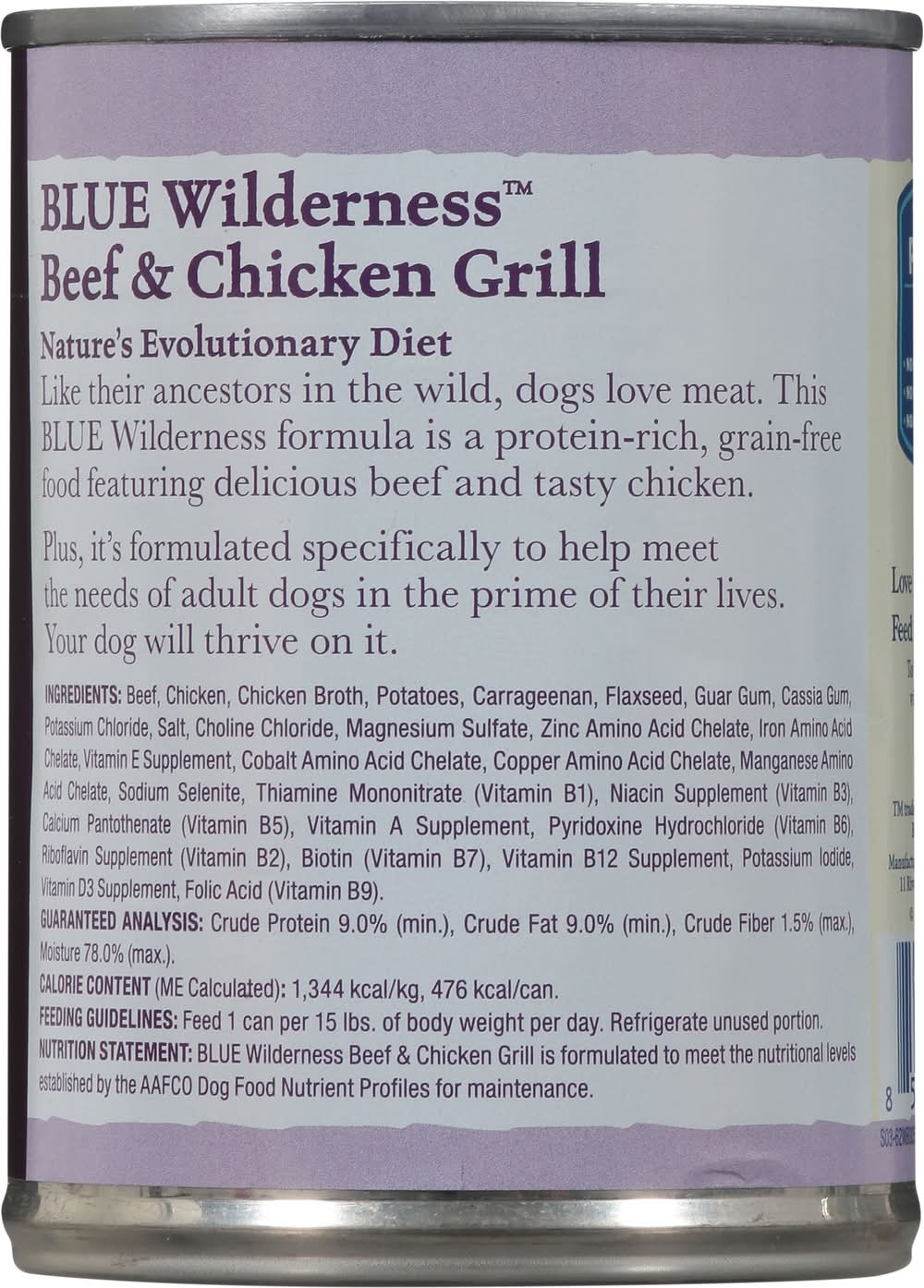 Natural food for dogs enhanced with added vitamins & minerals. No artificial flavors or preservatives. High-protein food for dogs. Healthy holistic. Nature's Evolutionary Diet: Like their ancestors in the wild, dogs love meat. This Blue Wilderness formula is a protein-rich, grain-free food featuring delicious beef and tasty chicken. Plus, it's formulated specifically to help meet the needs of adult dogs in the prime of their lives. Your dog will thrive on it. True Blue Promise: Always starts with protein-rich beef. No chicken/poultry by-product meals; no corn. Love them like family. • Size: 0.90 lb • Blue Buffalo Company, Ltd., 11 River Road,Wilton,CT,06897,USA • Packaging: Reusable