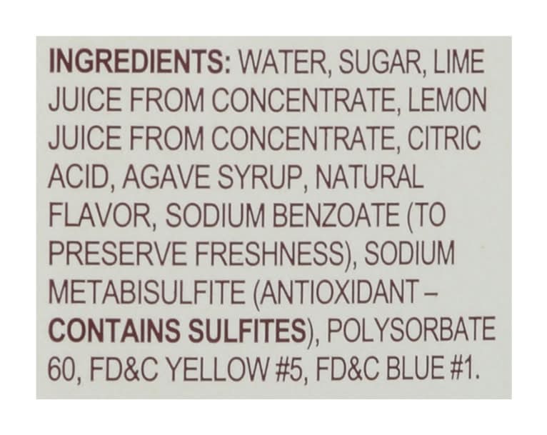 Ingredients: Water, Sugar, Lime Juice from Concentrate, Lemon Juice from Concentrate, Citric Acid, Agave Syrup, Natural Flavor, Sodium Benzoate (to Preserve Freshness), Sodium Metabisulfite (Antioxidant - Contains Sulfites), Polysorbate 60, FD&C Yellow 5, FD&C Blue 1 Contains: Sulfites