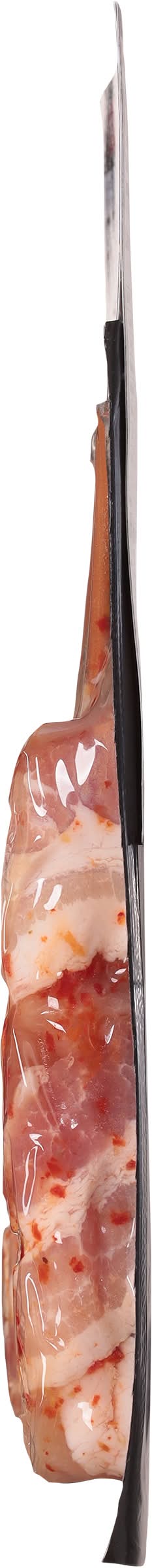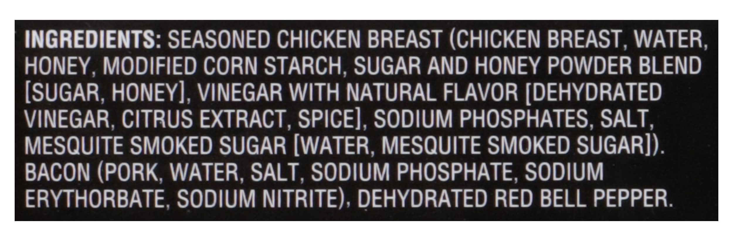 Ingredients: Seasoned Chicken Breast (Chicken Breast, Water, Honey, Modified Corn Starch, Sugar and Honey Powder Blend [Sugar, Honey], Vinegar with Natural Flavor [Dehydrated Vinegar, Citrus Extract, Spice], Sodium Phosphates, Salt, Mesquite Smoked Sugar [Water, Mesquite Smoked Sugar]), Bacon (Pork, Water, Salt, Sodium Phosphate, Sodium Erythorbate, Sodium Nitrite), Dehydrated Red Bell Pepper Contains: Corn