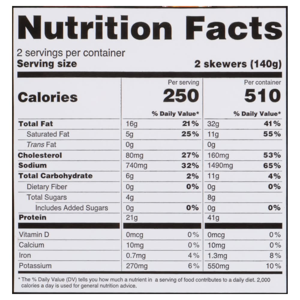Directions for use: Safe Handling Instructions: This product was prepared from inspected and passed meat and/or poultry. Some food products may contain bacteria that could cause illness if the product is mishandled or cooked improperly. For your protection, follow these safe handling instructions. Keep refrigerated or frozen. Thaw in refrigerator or microwave. Keep raw meat and poultry separate from other foods. Wash working surfaces (including cutting boards), utensils and hands after touching raw meat or poultry. Cook thoroughly. Keep hot foods hot. Refrigerate leftovers immediately or discard. Cooking instructions: Cook to minimum internal temperature of 165 degrees F (74 degrees C) BBQ: Brush grill with vegetable oil and preheat barbecue to medium-low heat. Remove skewers from package and place on grill. Grill for 10 to 12 minutes, turning occasionally. Frying Pan: Remove skewers from package and place in nonstick frying pan. Cook over medium heat for 10 to 12 minutes, turning occasionally. Conventional Oven: Preheat oven to 425 degrees F (220 degrees C). Remove skewers from package and place on foil or parchment-lined baking sheet. Cook for 16 to 18 minutes, turning once. Clamshell Electric Grill: Preheat grill to medium high. Remove skewers from package and pace in grill. Cook for 8 to 10 minutes. Appliances vary; these are guidelines only. previously frozen for your protection, keep refrigerated or freeze. Storage recommendation: previously frozen for your protection, keep refrigerated or freeze.