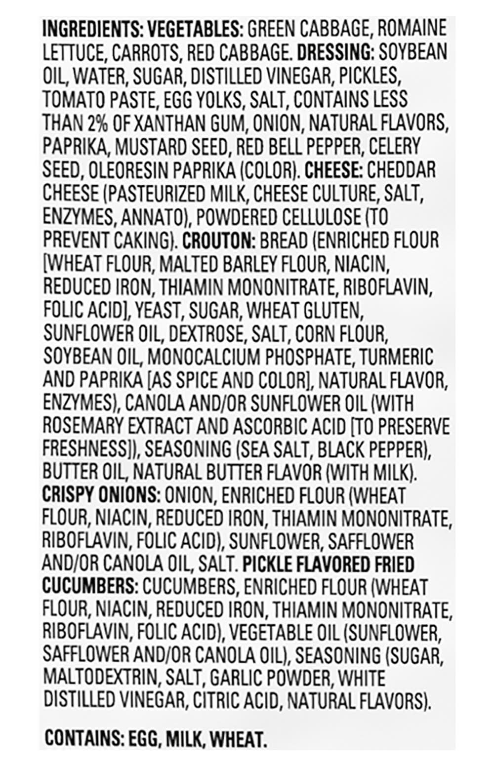 Ingredients: Vegetables: Green Cabbage, Romaine Lettuce, Carrots, Red Cabbage. Dressing: Soybean Oil, Water, Sugar, Distilled Vinegar, Pickles, Tomato Paste, Egg Yolks, Salt, Contains Less than 2% of Xanthan Gum, Onion, Natural Flavors, Paprika, Mustard Seed, Red Bell Pepper, Celery Seed, Oleoresin Paprika (Color). Cheese: Cheddar Cheese (Pasteurized Milk, Cheese Culture, Salt, Enzymes, Annato), Powdered Cellulose (to Prevent Caking). Crouton: Bread (Enriched Flour [Wheat Flour, Malted Barley Flour, Niacin, Reduced Iron, Thiamin Mononitrate, Riboflavin, Folic Acid], Yeast, Sugar, Wheat Gluten, Sunflower Oil, Dextrose, Salt, Corn Flour, Soybean Oil, Monocalcium Phosphate, Turmeric and Paprika [as Spice and Color], Natural Flavor, Enzymes), Canola and/or Sunflower Oil (with Rosemary Extract and Ascorbic Acid [to Preserve Freshness]), Seasoning (Sea Salt, Black Pepper), Butter Oil, Natural Butter Flavor (with Milk). Crispy Onions: Onion, Enriched Flour (Wheat Flour, Niacin, Reduced Iron, Thiamin Mononitrate, Riboflavin, Folic Acid), Sunflower, Safflower and/or Canola Oil, Salt. Pickle Flavored Fried Cucumbers: Cucumbers, Enriched Flour (Wheat Flour, Niacin, Reduced Iron, Thiamin Mononitrate, Riboflavin, Folic Acid), Vegetable Oil (Sunflower, Safflower and/or Canola Oil), Seasoning (Sugar, Maltodextrin, Salt, Garlic Powder, White Distilled Vinegar, Citric Acid, Natural Flavors) Contains: Eggs, Milk, Wheat, Soybeans, Celery, Barley, Corn, Mustard, Gluten