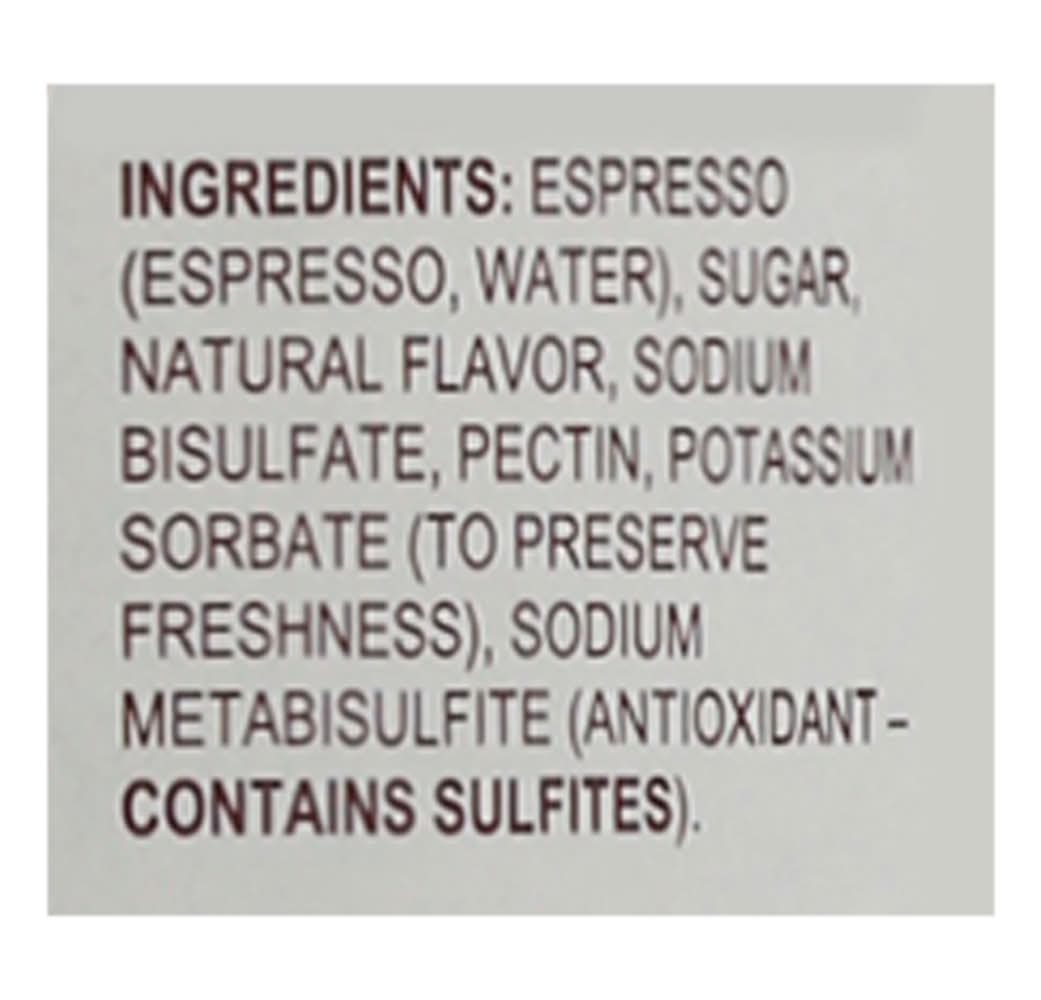 Ingredients: Espresso (Espresso, Water), Sugar, Natural Flavor, Sodium Bisulfate, Pectin, Potassium Sorbate (to Preserve Freshness), Sodium Metabisulfite (Antioxidant - Contains Sulfites) Contains: Sulfites