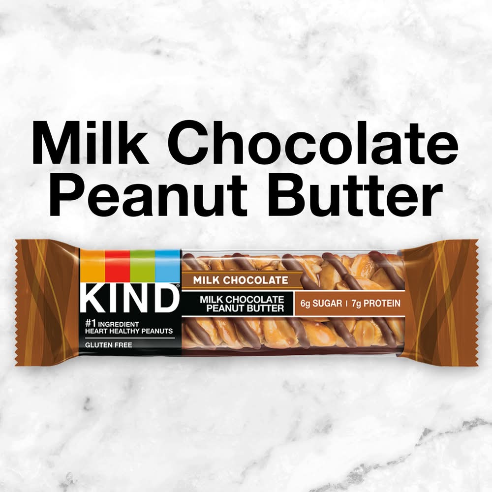 KIND Milk Chocolate Peanut Butter bars are satisfying gluten free bars packed with nuts and the taste of milk chocolate that you can take anywhere. These KIND nut bars lead with heart healthy peanuts as the #1 ingredient. This healthy snack bar combines quality ingredients like peanuts, milk chocolate and peanut butter to deliver a delicious taste with a little crunch. These snack bars come packed as individually wrapped snacks for a convenient option that makes eating healthy easier. It's the perfect nutrient-dense pick-me-up when life gets in the way. KIND bars Milk Chocolate Peanut Butter contain 6 grams of sugar, 7 grams of protein, and are high in fiber*. This KIND nut bar is also gluten free, has a low glycemic index, and is made without genetically engineered ingredients. *Contains 14g of fat per bar