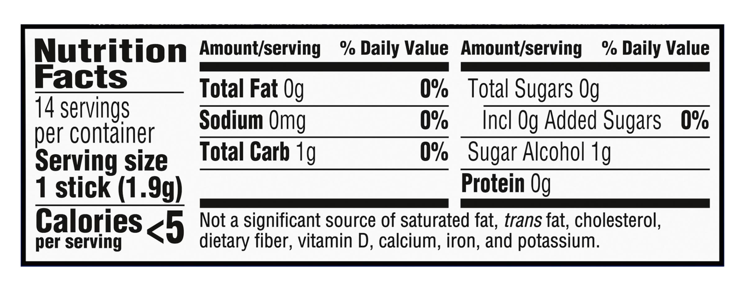 Ingredients: INGREDIENTS: SORBITOL, GUM BASE, XYLITOL, GLYCERIN, MANNITOL, NATURAL AND ARTIFICIAL FLAVOR; LESS THAN 2% OF: ACESULFAME POTASSIUM, ASPARTAME, BHT (TO MAINTAIN FRESHNESS), SUCRALOSE. PHENYLKETONURICS: CONTAINS PHENYLALANINE. Contains: PHENYLKETONURICS: CONTAINS PHENYLALANINE.