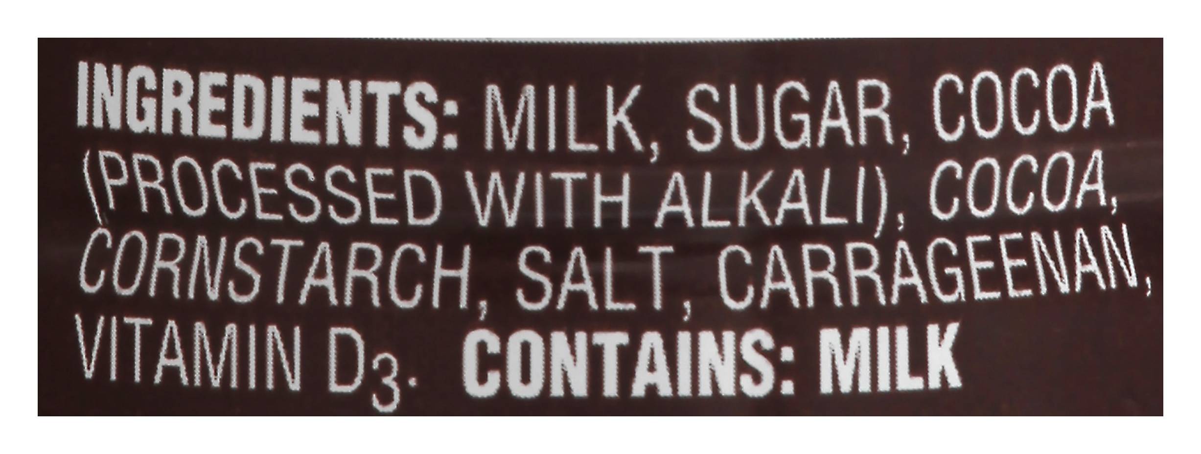 Ingredients: Milk, Sugar, Cocoa (Processed with Alkali), Cocoa, Cornstarch, Salt, Carrageenan, Vitamin D3 Contains: Milk