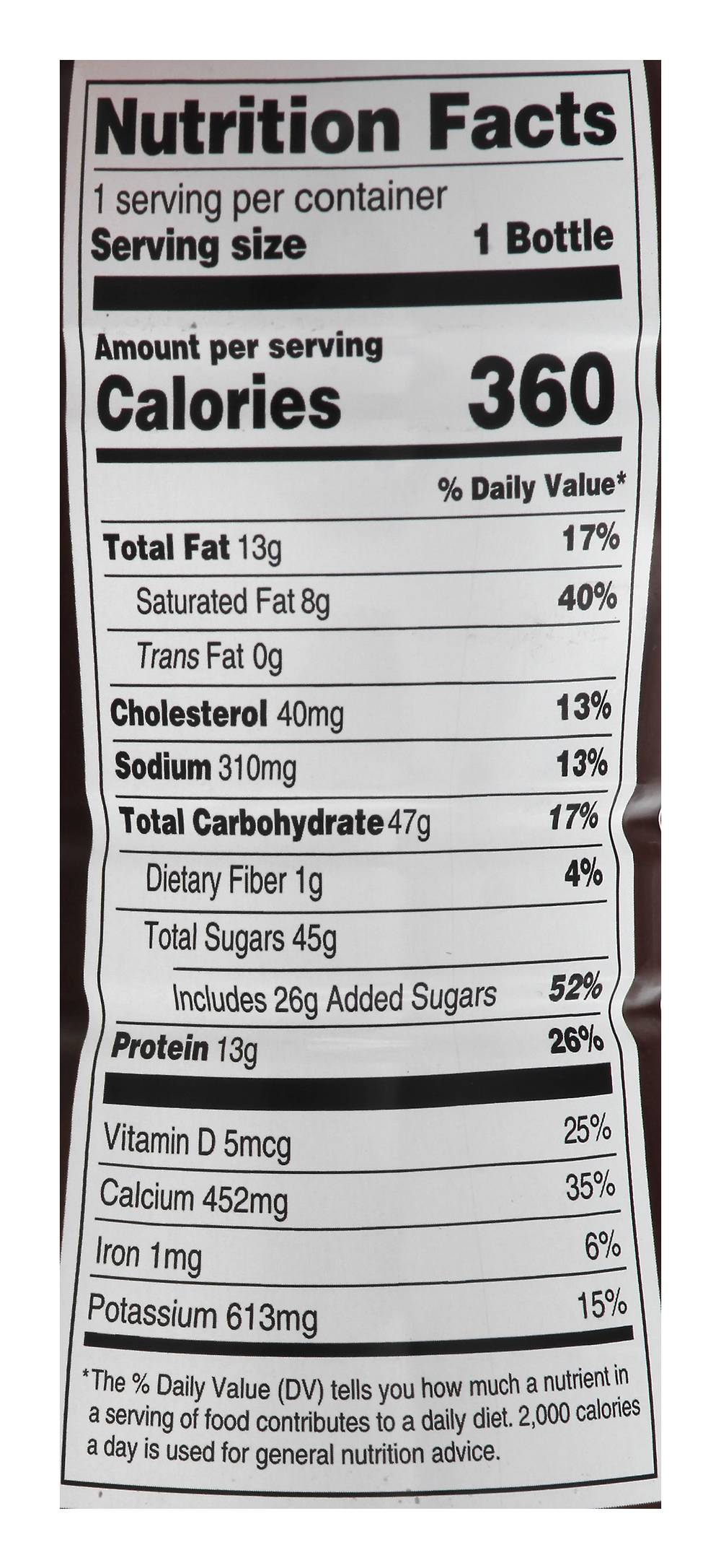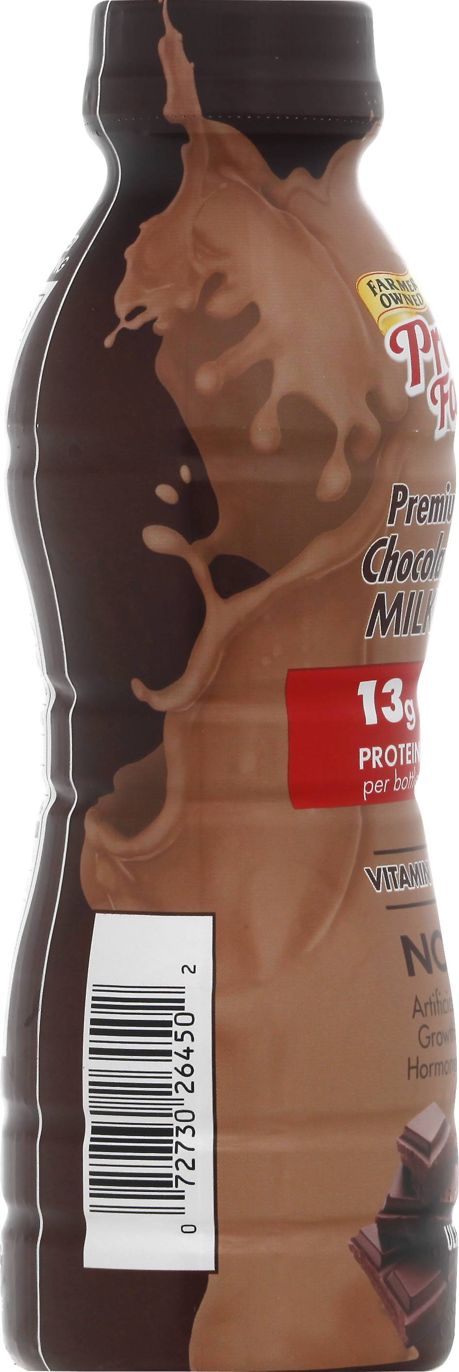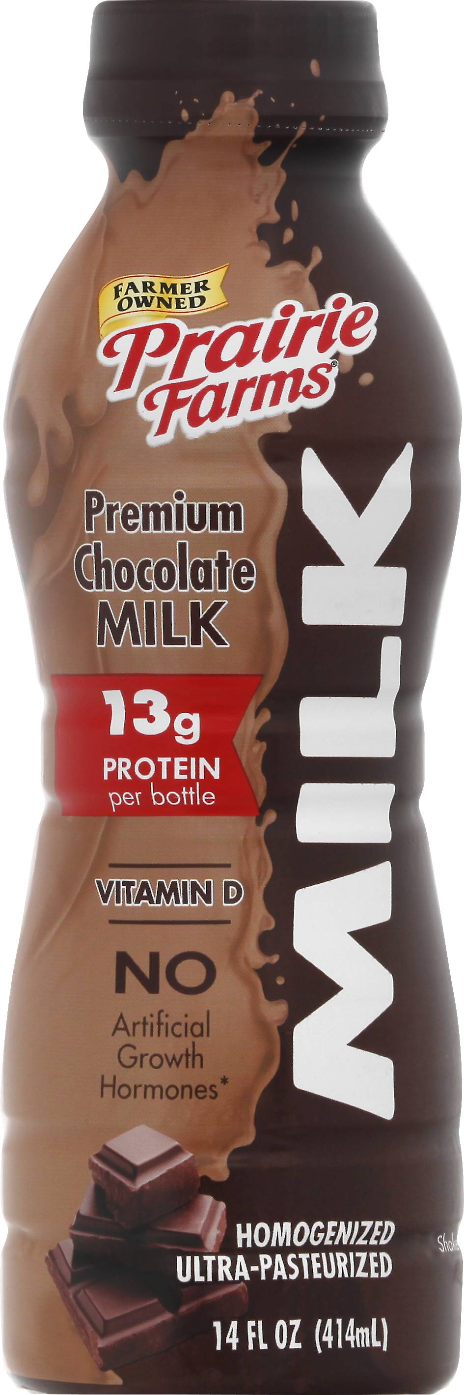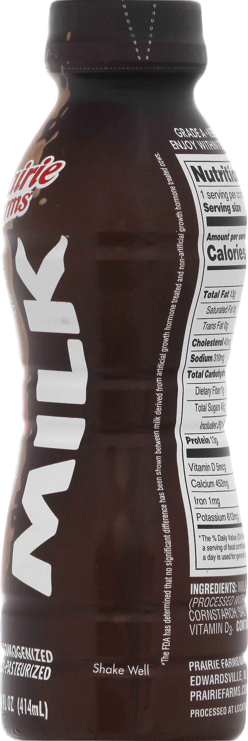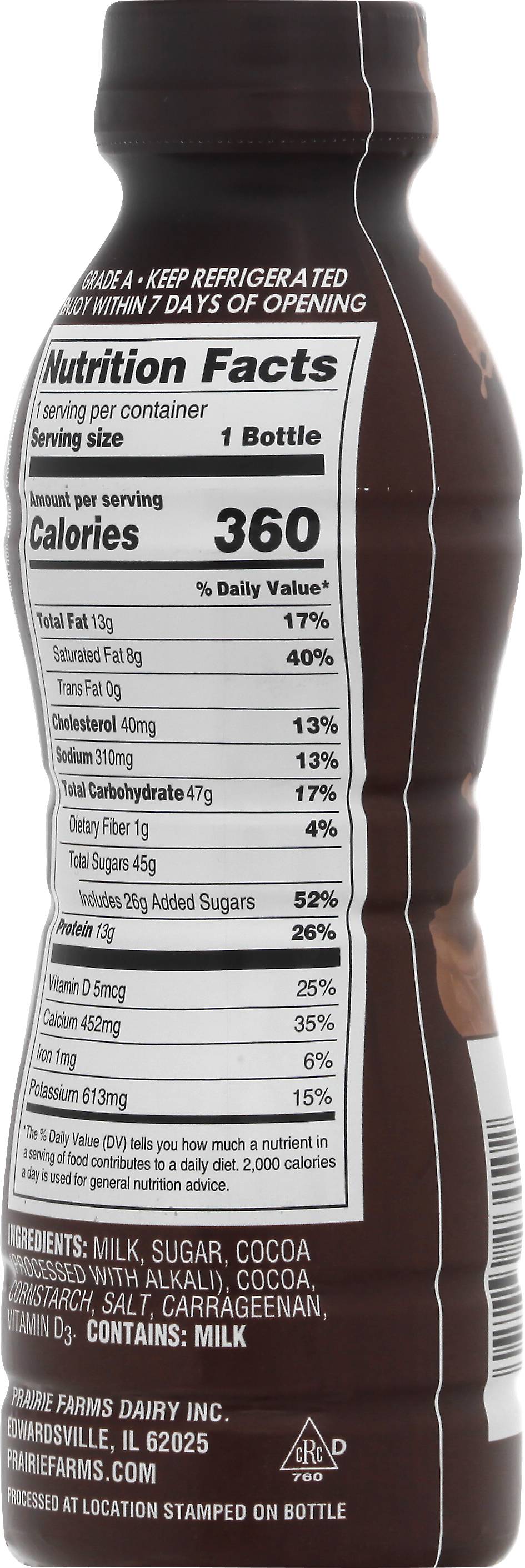13 g protein per bottle. Vitamin D. Farmed owned. No artificial growth hormones (The FDA has determined that no significant has been shown between milk derived from artificial growth hormone treated and non-artificial growth hormone treated cows). Homogenized. Ultra-pasteurized. Processed at location stamped on bottle. Grade A. prairiefarms.com. • Flavor: Premium chocolate • Prairie Farms Dairy, Inc., Erwardsville,IL,62025 • Packaging: Reusable