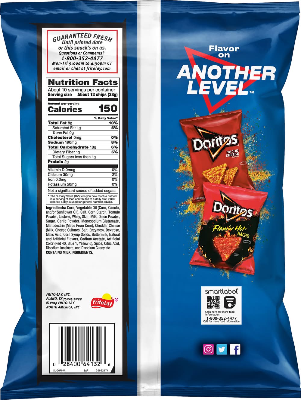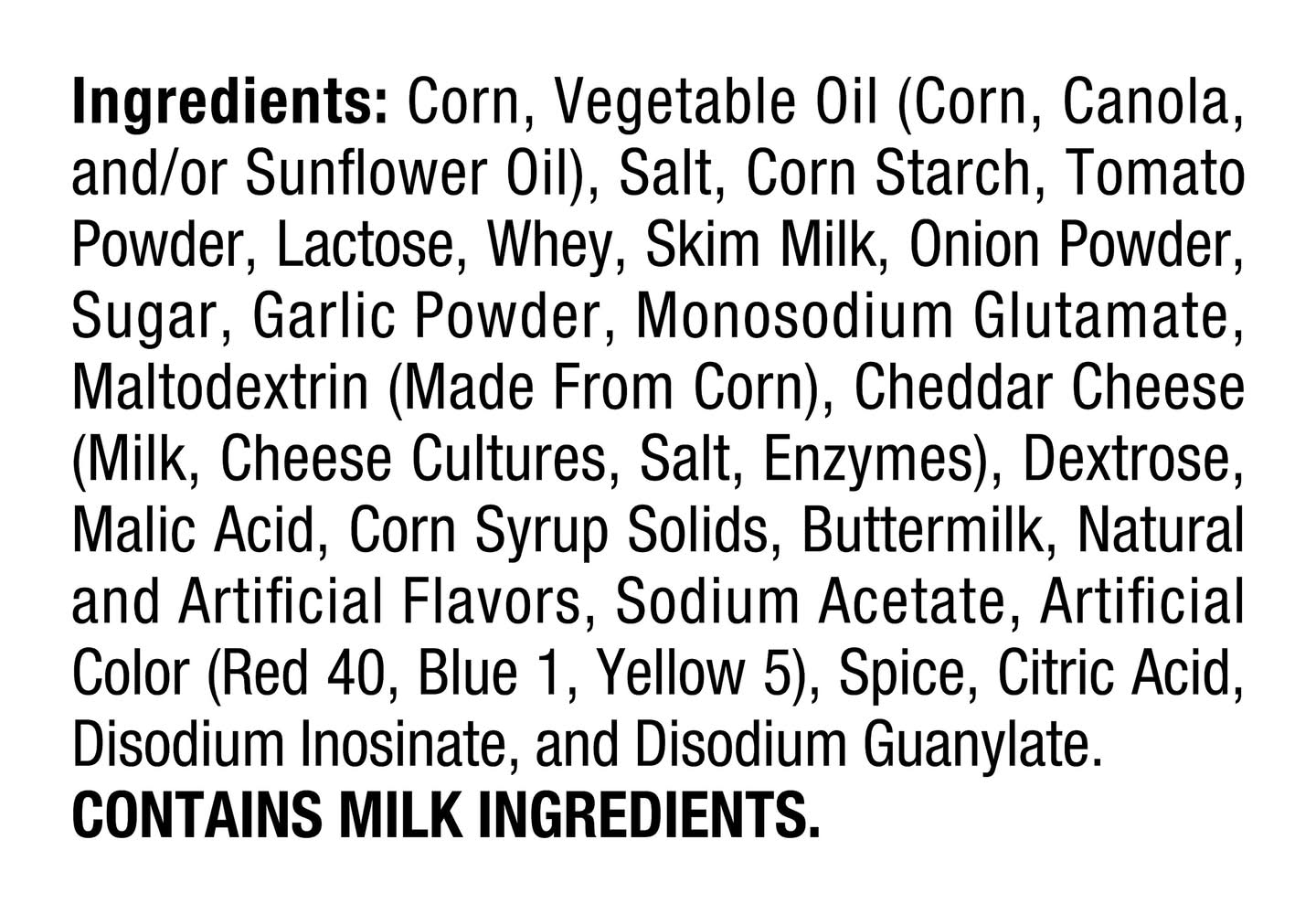 Ingredients: Corn, Vegetable Oil (Corn Canola and/or Sunflower Oil), Salt, Corn Starch, Tomato Powder, Lactose, Whey, Skim Milk, Onion Powder, Sugar, Garlic Powder, Monosodium Glutamate, Maltodextrin (Made from Corn), Cheddar Cheese (Milk Cheese Cultures Salt Enzymes), Dextrose, Malic Acid, Corn Syrup Solids, Buttermilk, Natural and Artificial Flavors, Sodium Acetate, Artificial Color (Red 40 Blue 1 Yellow 5), Spice, Citric Acid, Disodium Inosinate, and Disodium Guanylate
