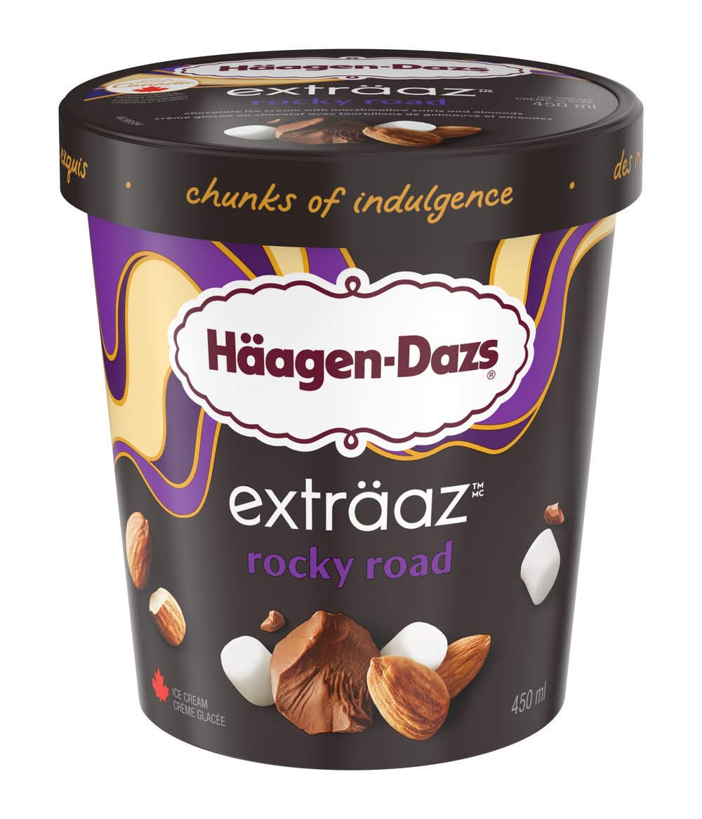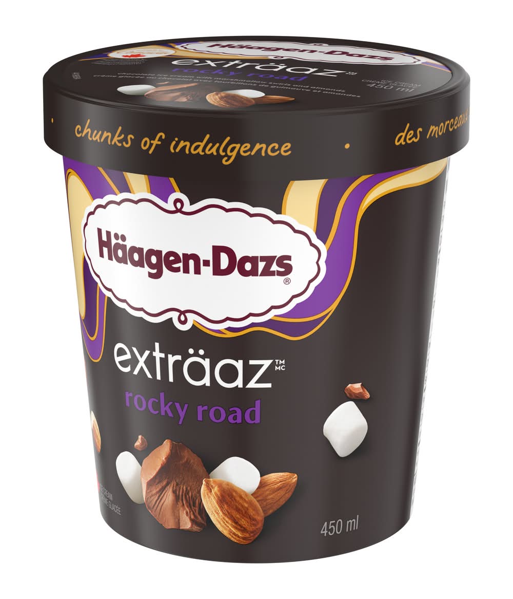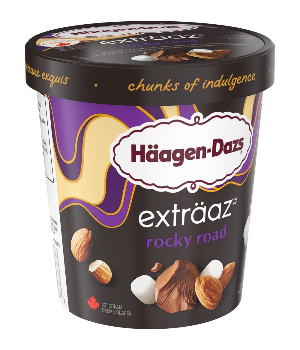 Take indulgence to the next level with HÄAGEN-DAZS® exträaz™ Rocky Road Ice Cream (450 ml). We’ve infused our decadently distinct HÄAGEN-DAZS® ice cream with textured ingredients, bringing you an indulgent experience that will satisfy your richest cravings. Fluffy ripples of marshmallow and roasted almonds come together in our legendary chocolate ice cream, made with Canadian dairy. The result is a delicious experience. Flavor: Rocky road