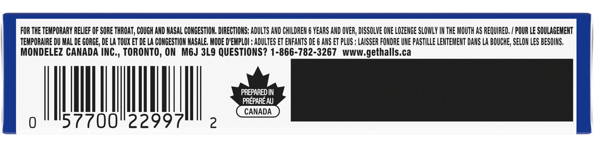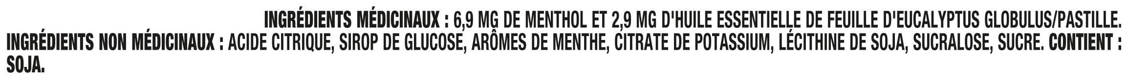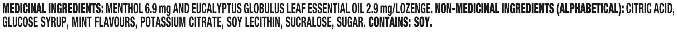 Ingredients: MEDICINAL INGREDIENTS: MENTHOL 6.9 mg AND EUCALYPTUS GLOBULUS LEAF ESSENTIAL OIL 2.9 mg, LOZENGE. NON-MEDICINAL INGREDIENTS (ALPHABETICAL), : CITRIC ACID, FDC BLUE NO. 1, FDC RED NO. 40, GLUCOSE SYRUP, GUM ARABIC, MINT FLAVOURS, POTASSIUM CITRATE, SOY LECITHIN, SUGAR. CONTAINS: SOY.
