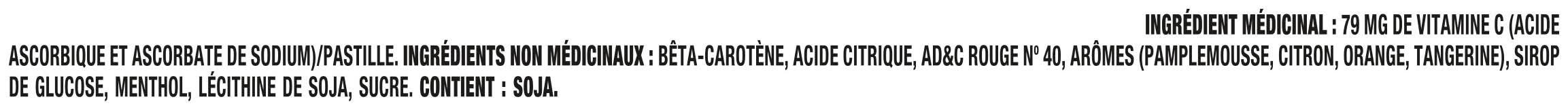 Ingredients: MEDICINAL INGREDIENT: VITAMIN C (ASCORBIC ACID AND SODIUM ASCORBATE), 79 mg, LOZENGE. NON-MEDICINAL INGREDIENTS (ALPHABETICAL), : BETA-CAROTENE, CITRIC ACID, FDC RED NO. 40, FLAVOURS (GRAPEFRUIT, LEMON, ORANGE, TANGERINE), GLUCOSE SYRUP, MENTHOL, SOY LECITHIN, SUGAR. CONTAINS: SOY.