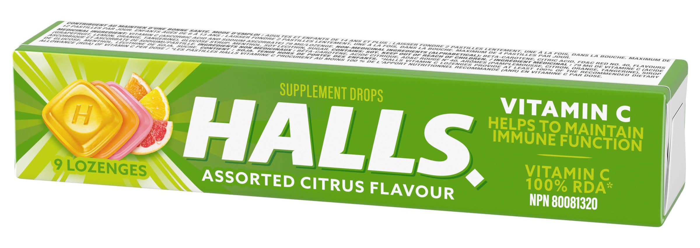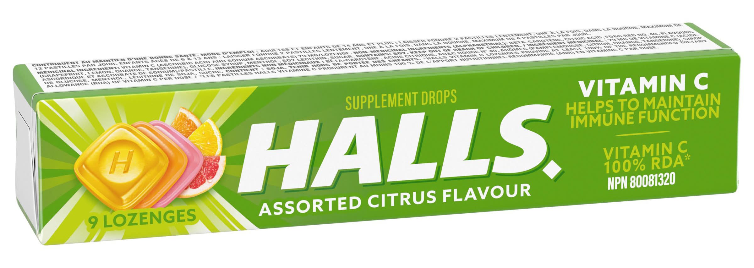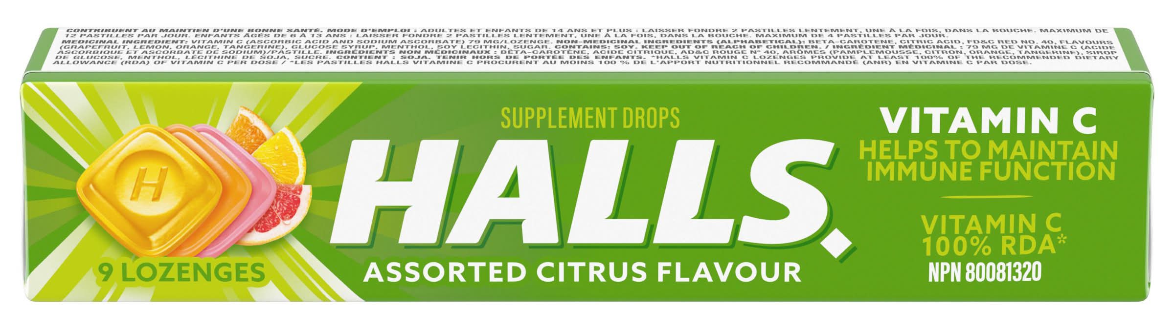 HALLS Vitamin C Assorted Citrus Supplement Drops, 9 Lozenges. Helps to Maintain Immune Function, A Factor in the Maintenance of Good Health.