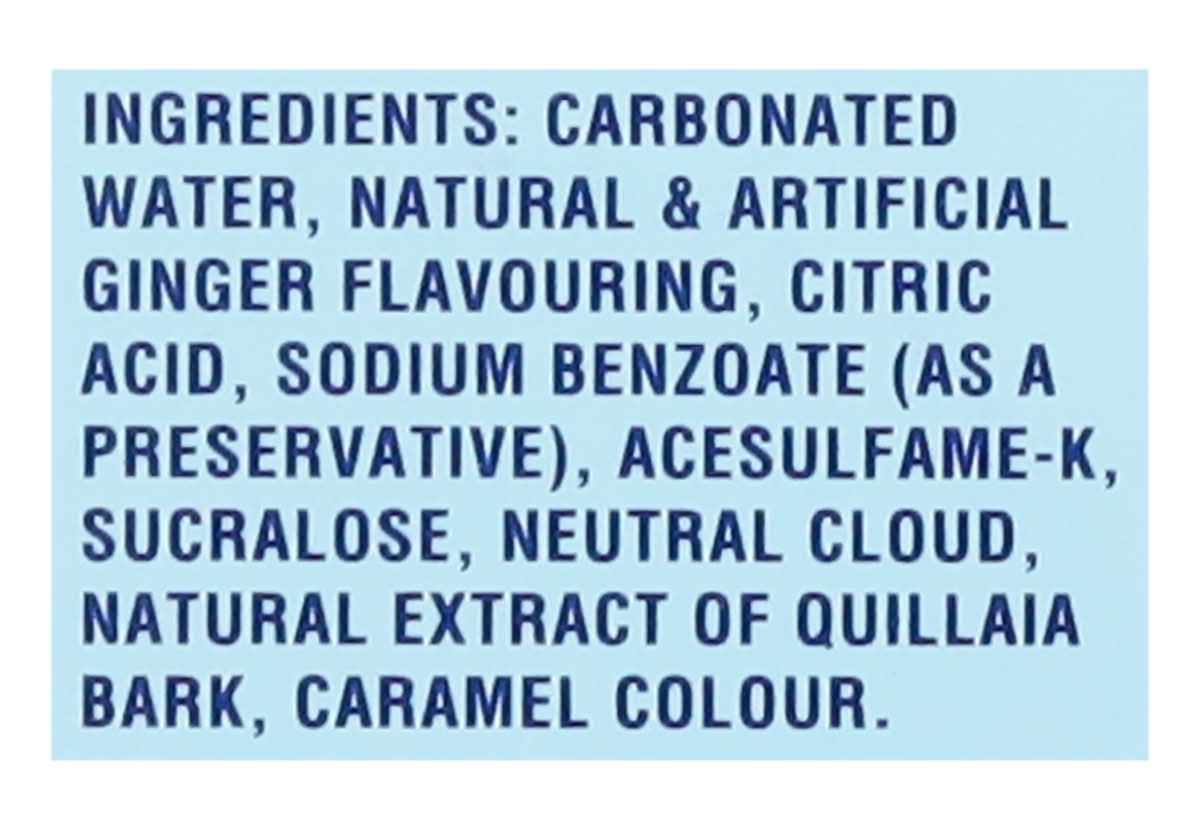 Ingredients: Carbonated Water, Natural & Artificial Ginger Flavouring, Citric Acid, Sodium Benzoate (as a Preservative), Acesulfame-K, Sucralose, Neutral Cloud, Natural Extract of Quillaia Bark, Caramel Colour