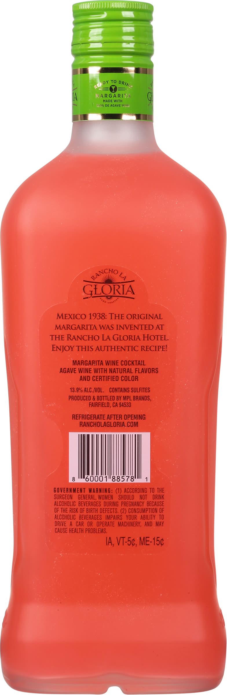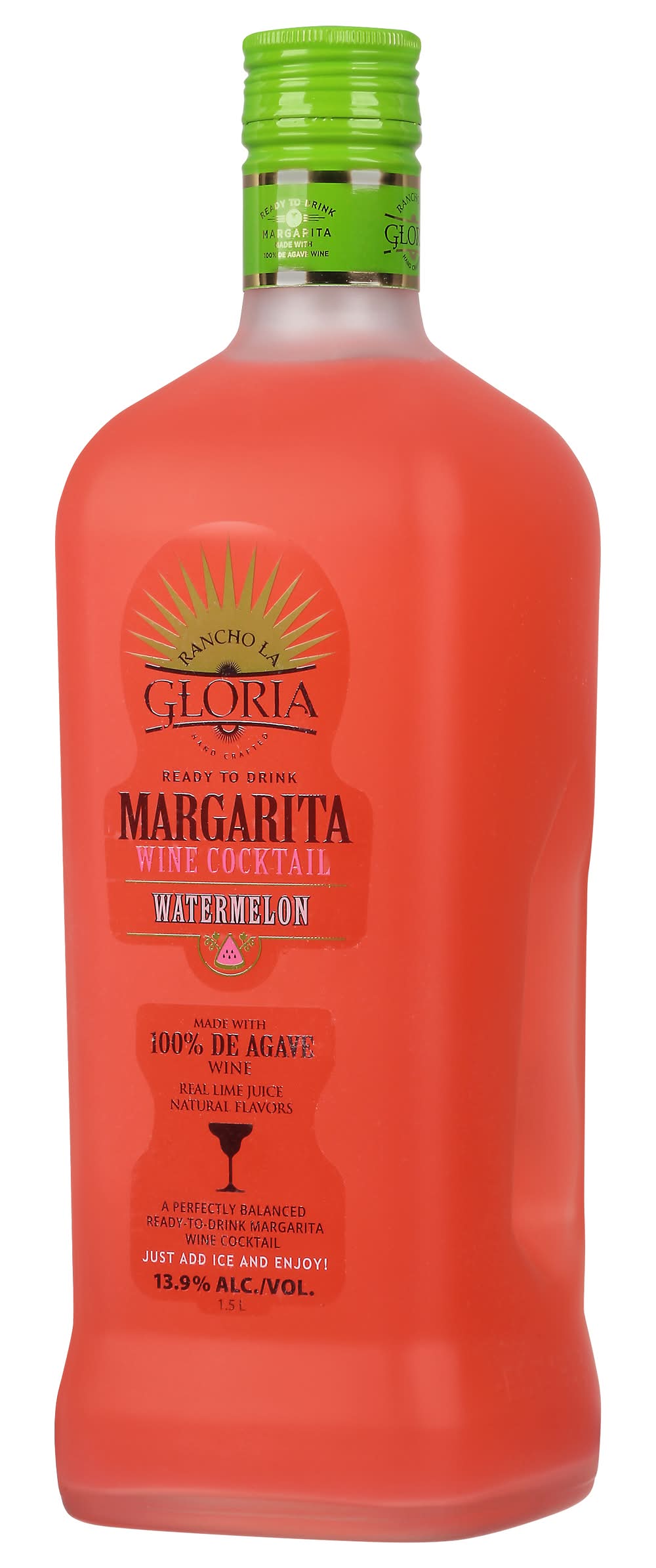 Margarita wine cocktail agave wine with natural flavors and certified color. Natural flavors. Ready to drink. Real lime juice. A perfectly balanced ready-to-drink margarita wine cocktail. Just add ice and enjoy! Mexico 1938: The original margarita was invented at the Rancho La Gloria hotel. • Flavor: Watermelon • Alcohol by volume: 13.9%
