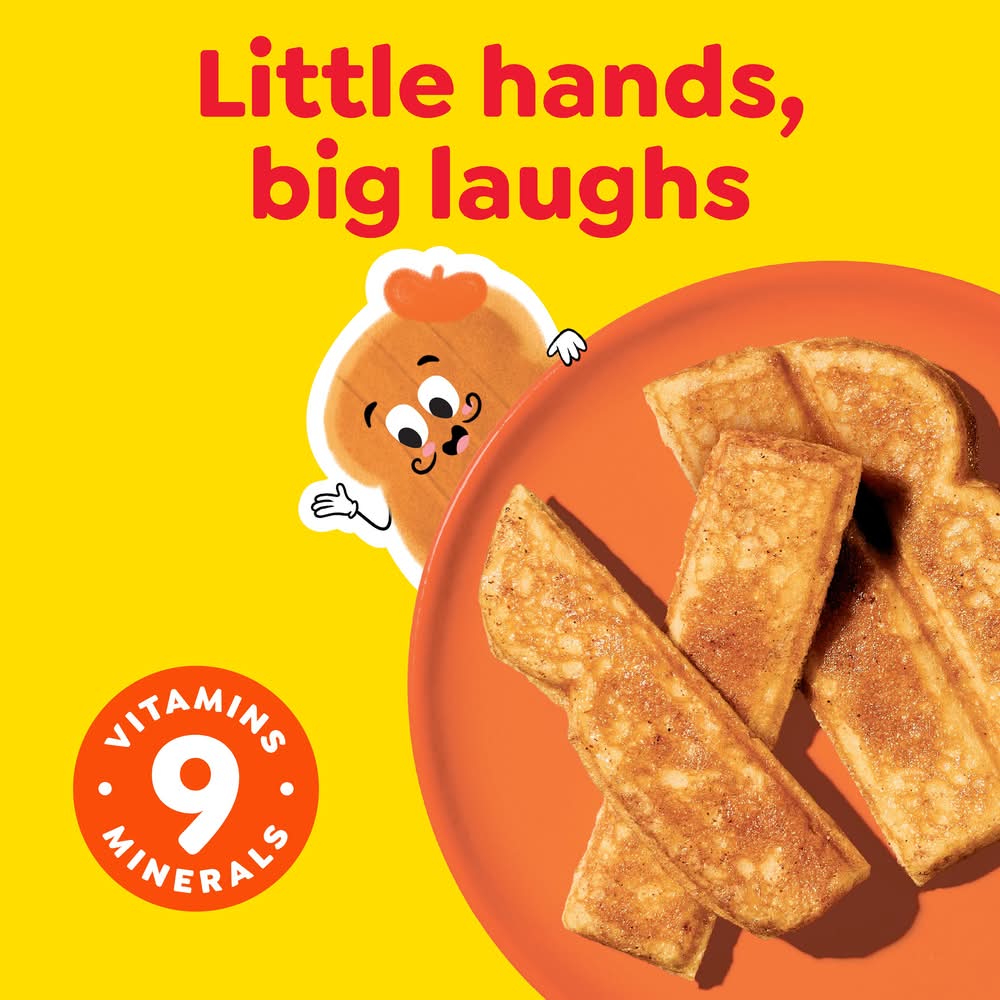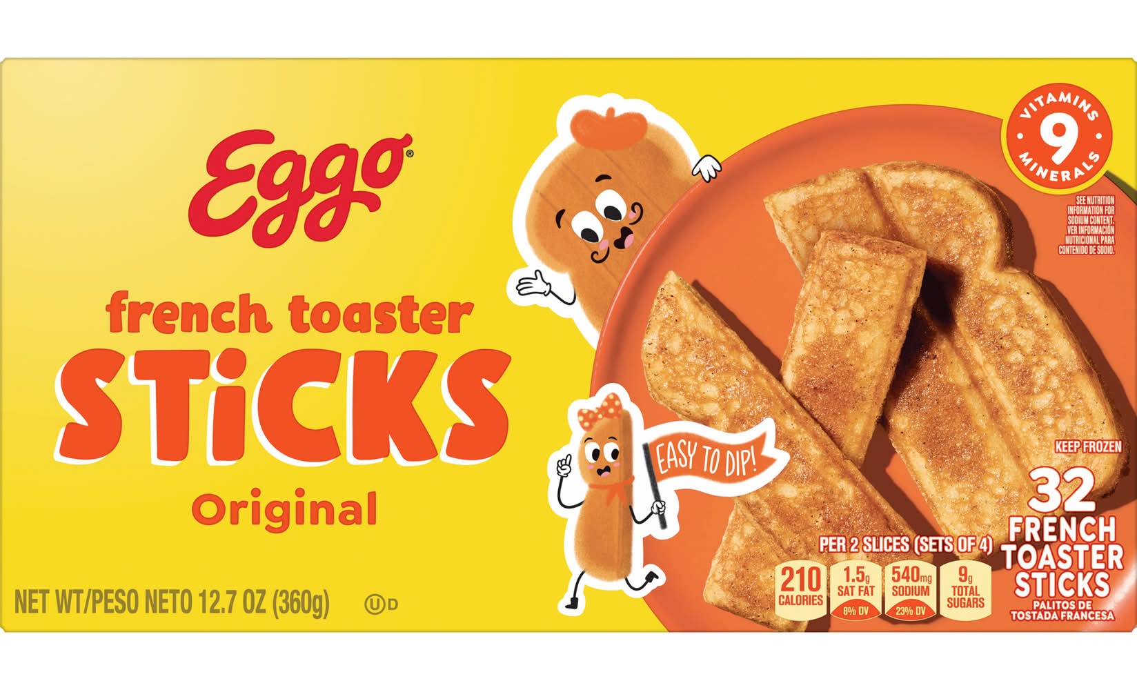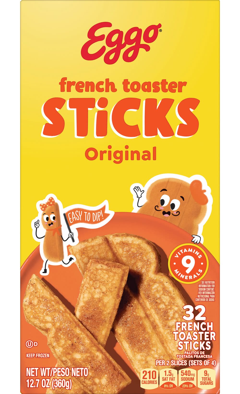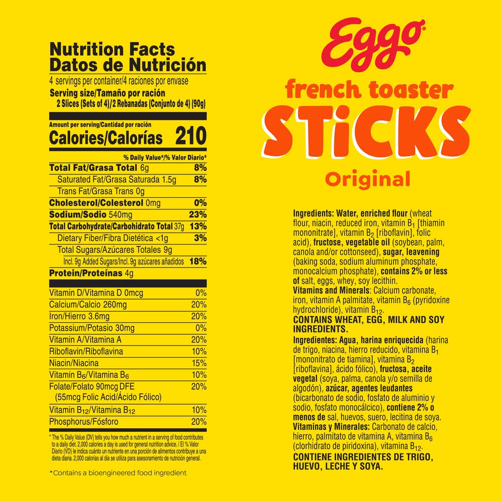 Wake up and greet the day with the feel-good taste of Eggo French Toaster sticks. Crafted with delicious ingredients, our French Toaster sticks bring fun and flavor to busy mornings. An easy part of breakfast, each slice brings warmth to your day. Great for families and individuals, they're yummy on their own, or try them with the addition of your favorite morning toppings like butter, syrup, fruit, powdered sugar, and whipped cream; Made with no artificial colors or flavors, they provide a good source of 9 vitamins and minerals (see nutrition information for sodium content) and are an excellent source of calcium. Eggo French Toaster sticks are great to bring along on the bus, in the car on the way to school, packed in a lunch box, or for a tasty snacking occasion on-the-go. So delicious, would you L'Eggo your Eggo? • Number of servings: 4 • Packaging: Reusable