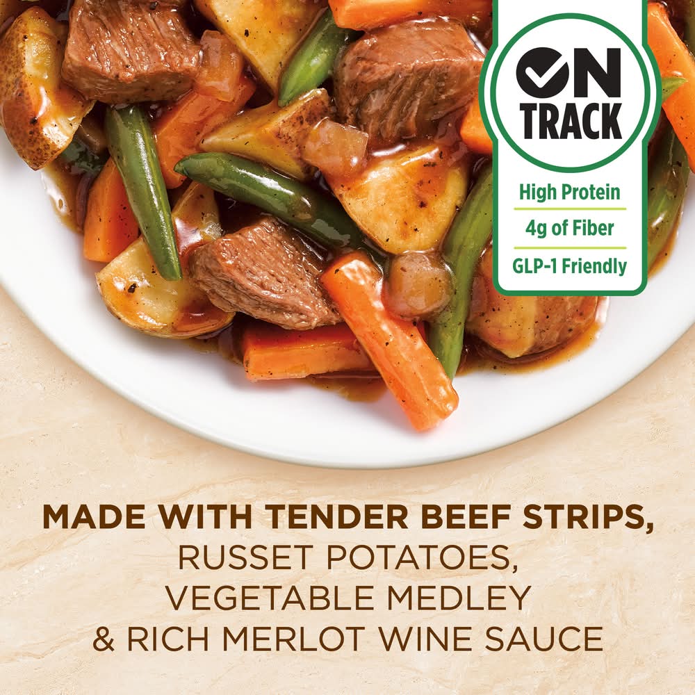 Enjoy satisfying and quick meals with Healthy Choice Cafe Steamers Beef Merlot. Healthy Choice Café Steamers offer deliciously healthy frozen meals that help you stay on track. This beef merlot steamer brings together tender beef strips with russet potatoes and a vegetable medley in a rich merlot wine sauce for a dish that is as flavorful as it is healthy. It is gluten free, made with no preservatives and is GLP-1 friendly with 13 grams of protein, 4 grams of fiber and 180 calories, delivering a wholesome microwave meal that doesn't sacrifice flavor. Perfect for a quick lunch or dinner after a long day, keep this delicious ready-made meal in your freezer to always have healthy meals on hand. • Flavor: Beef • Conagra Brands, PO Box 3534,Chicago,IL.