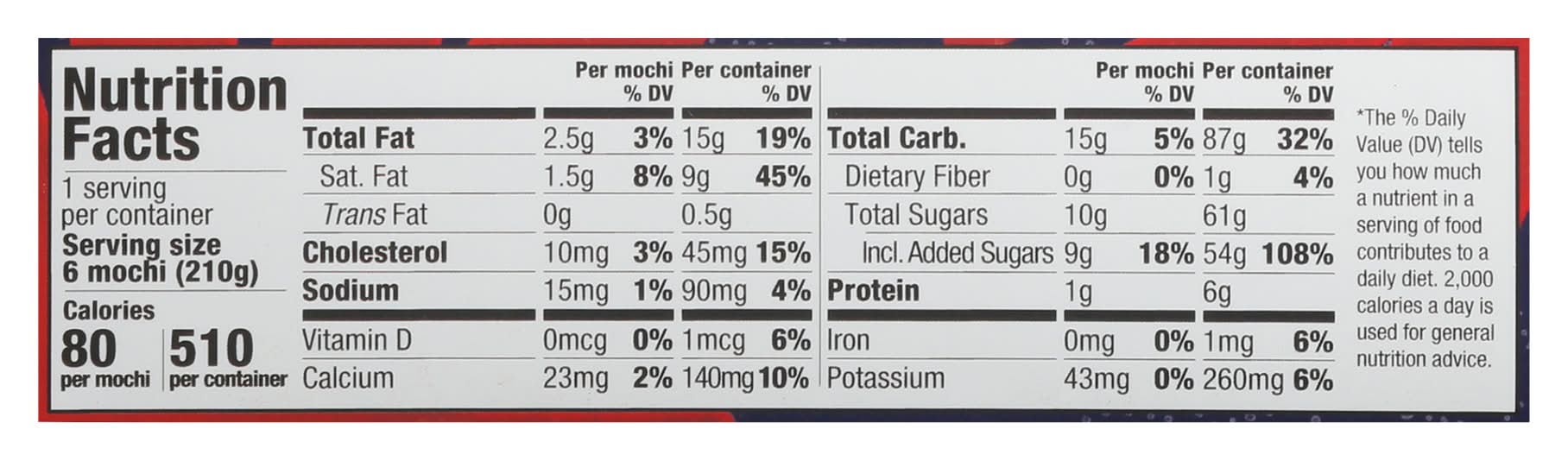 Ingredients: Strawberry Ice Cream (Non-Fat Milk, Cream, Cane Sugar, Strawberry Puree, Natural Flavors, Locust Bean Gum, Guar Gum, Pectin, Citric Acid, Ascorbic Acid, Vegetable Juice [Color]), Mochi Dough (Cane Sugar, Sweet Rice Flour, Water, Tapioca Syrup, Egg Whites, Vegetable Juice [Color]) Contains: Eggs, Milk, Peanuts, Tree Nuts, Soybeans